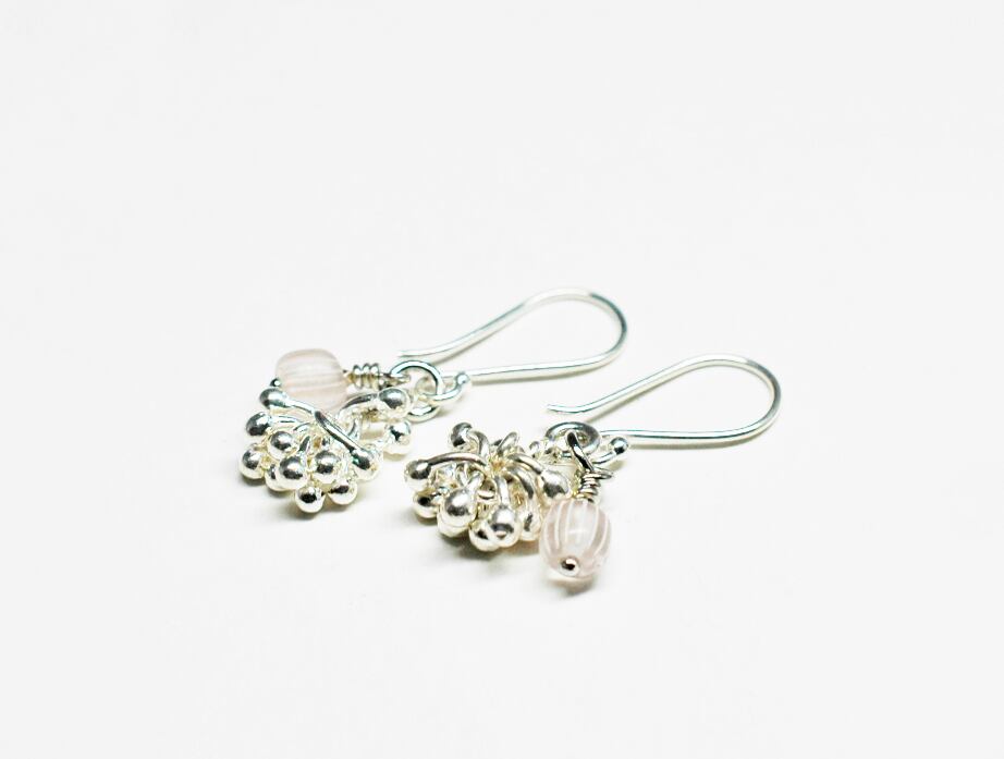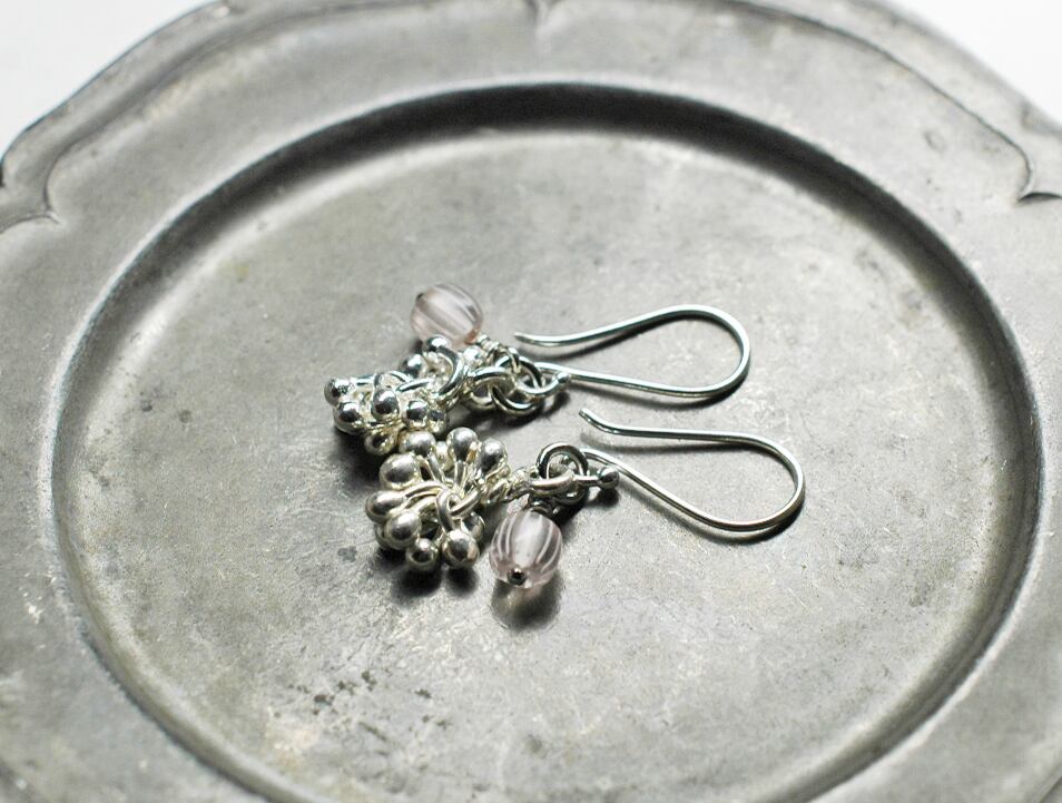 薄桃色のグーズベリーにしゃらりとしたカレンシルバーが優しい印象のピアスです。