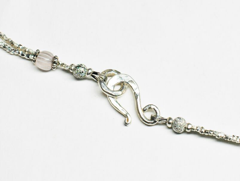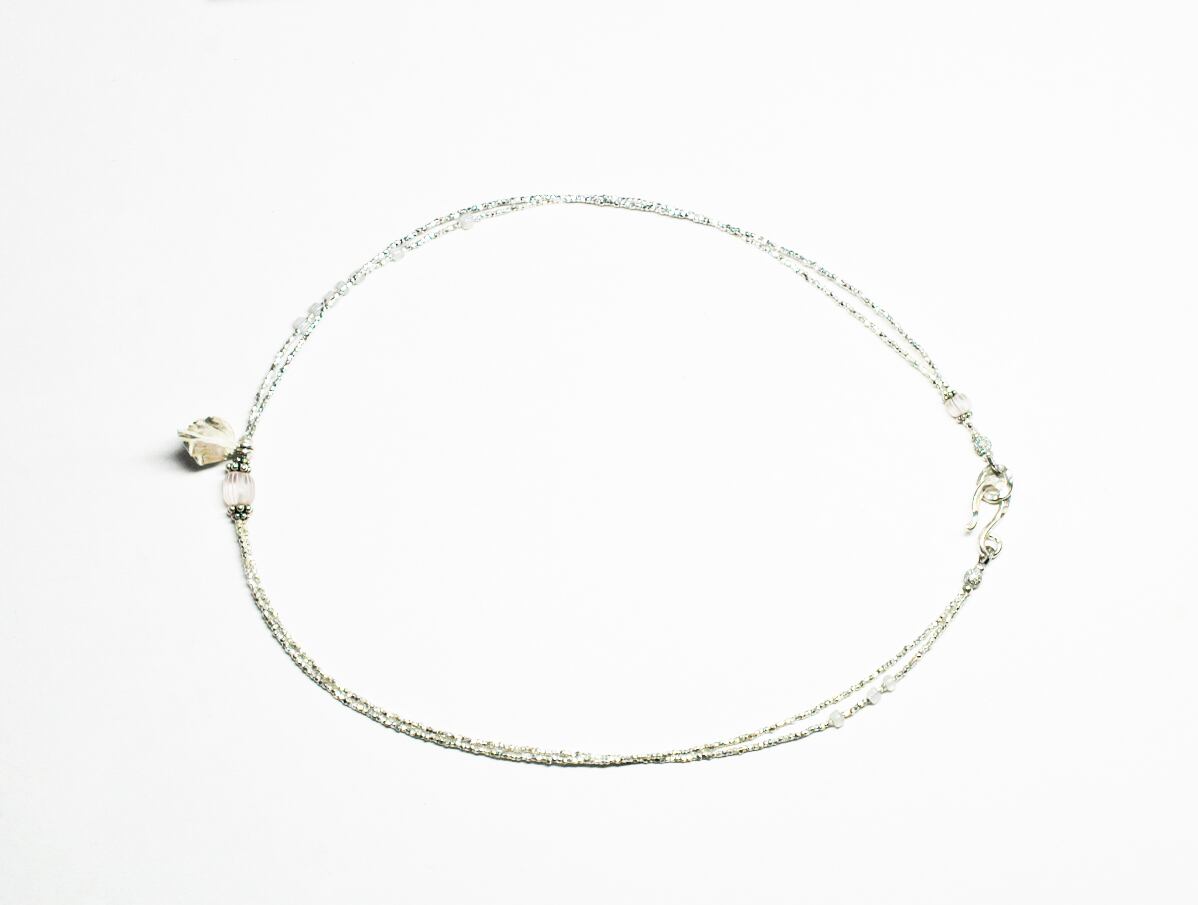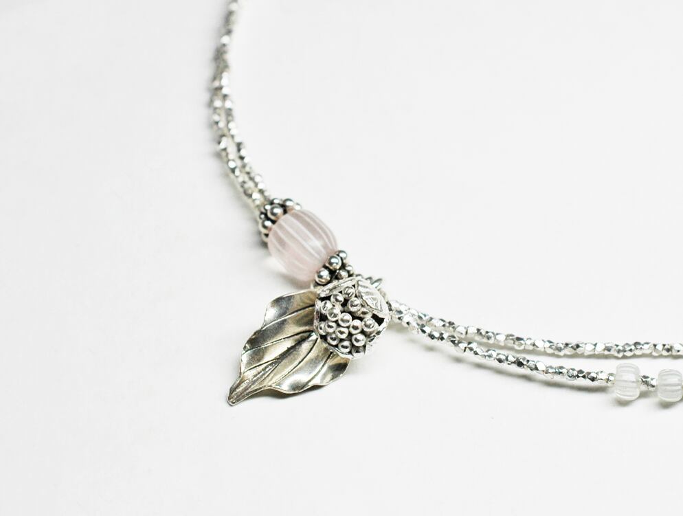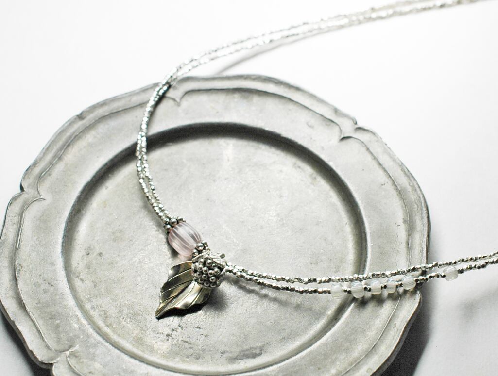 ほんのり桃色のアンティークビーズと、ボタニカルなカレンシルバーチャームをキラキラの小さなカレンシルバービーズで繋げた2連のネックレスです。