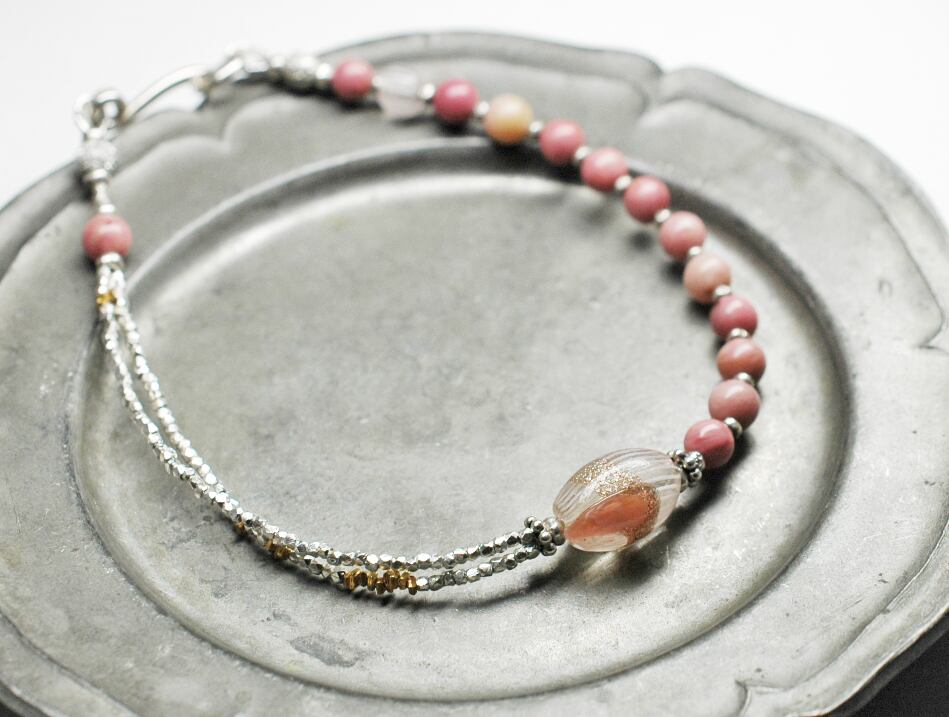 ベネチアビーズの花びら模様に似た色合いの、天然石のロードナイトと、キラキラとしたカレンシルバーで繋ぎました。