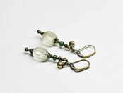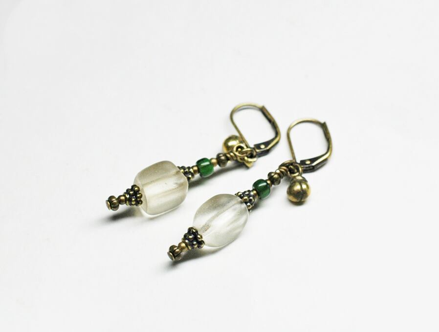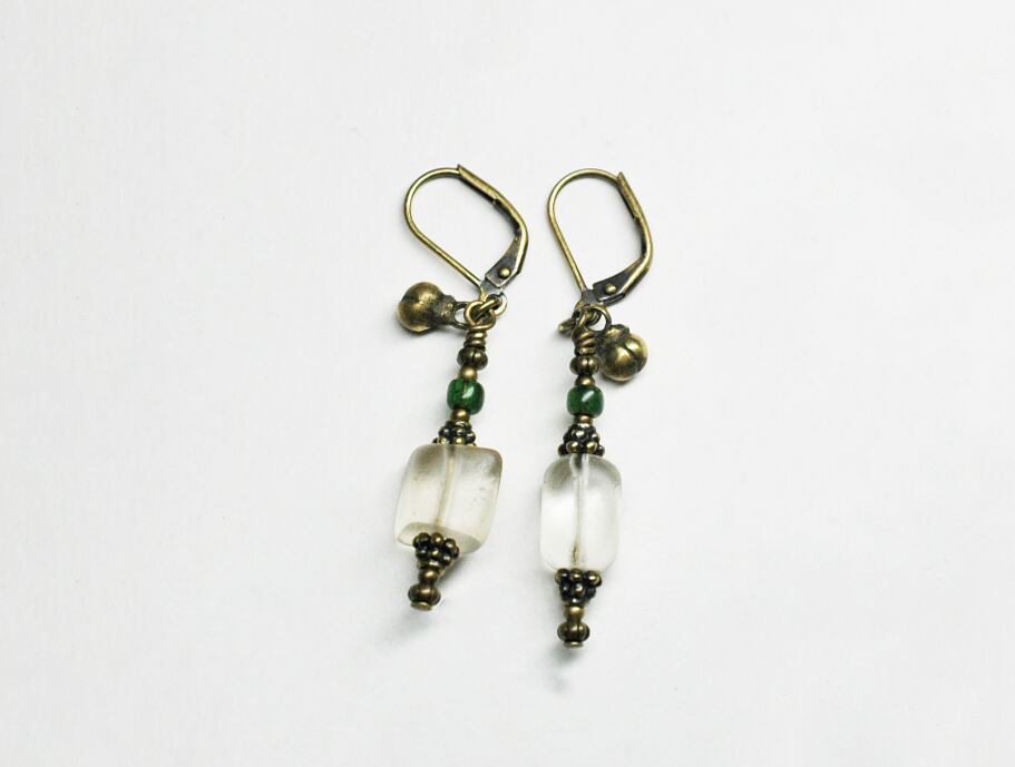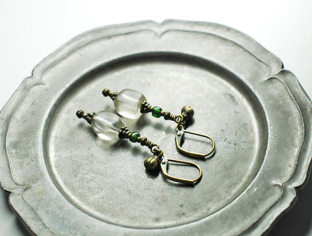 ぽってりとしたボヘミアのアンティークビーズと、民族の鈴、グリーンのビーズを繋いだアンシメトリーなピアスです