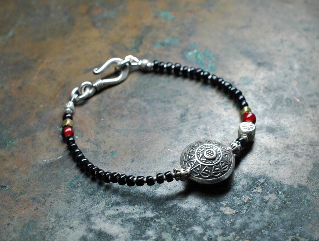 ちょっとぷっくりしたカレンシルバーをトップにして、ブラックのアンティークビーズで繋いだブレスです。