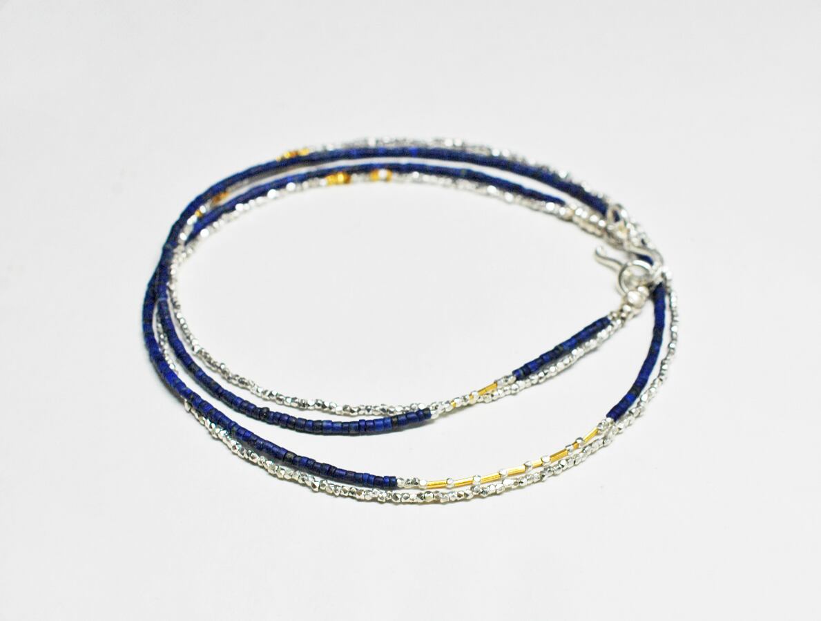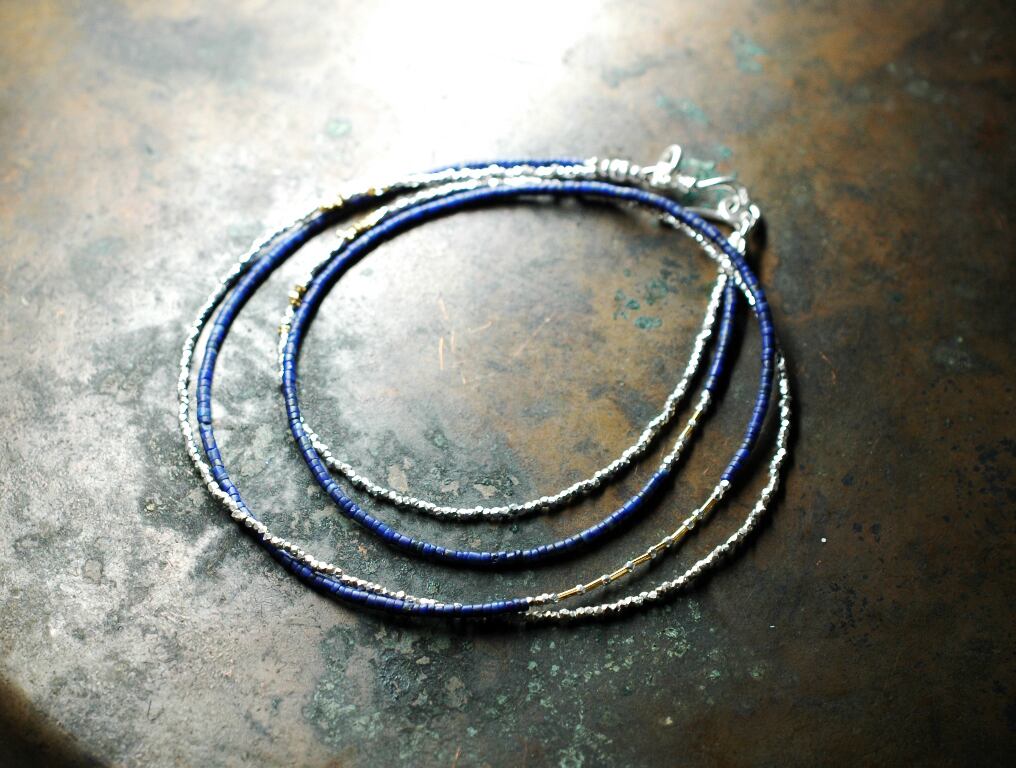 とっても小さなビーズを繋げています。華奢なデザインですがキラキラとしたカレンシルバーとラピスの深い色合いが目を惹きます。