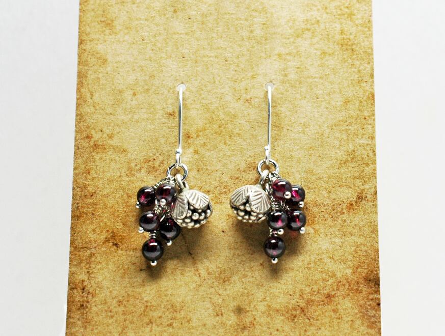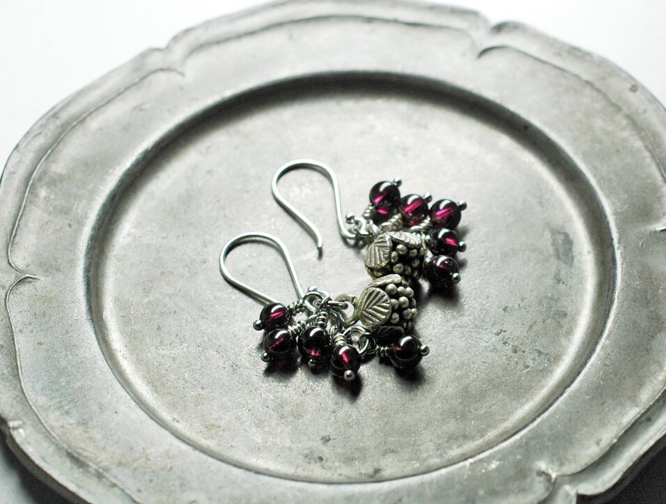 とっても深いボルドー色をしたガーネットはづつ片耳に5粒づつ流れるようなシルエットで実らせています。