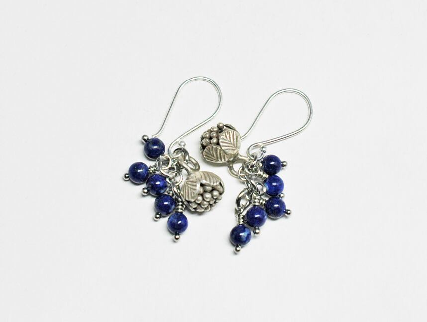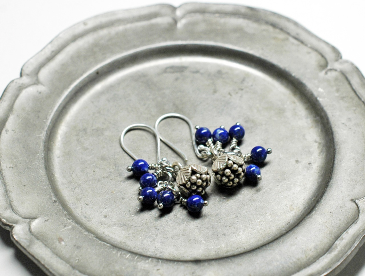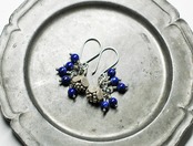 濃いブルーのラピスラズリは片耳に5粒づつ流れるようなシルエットで実らせています。