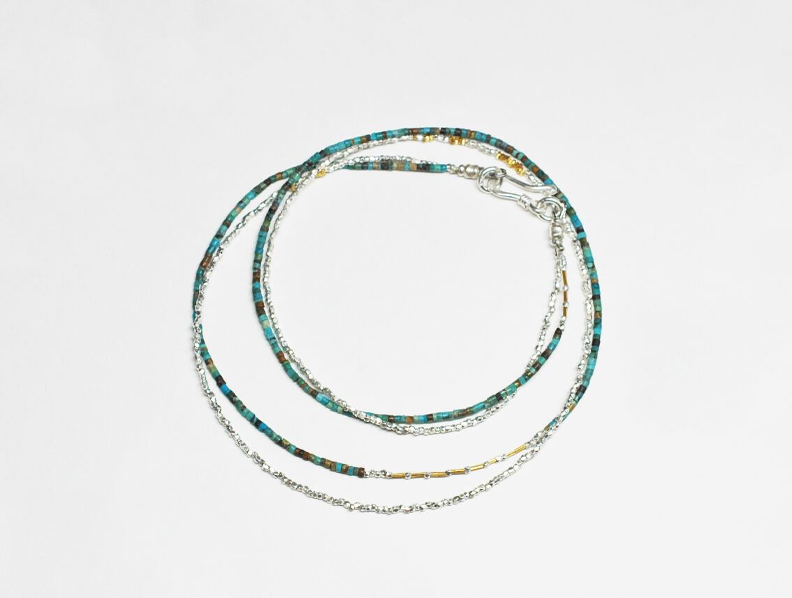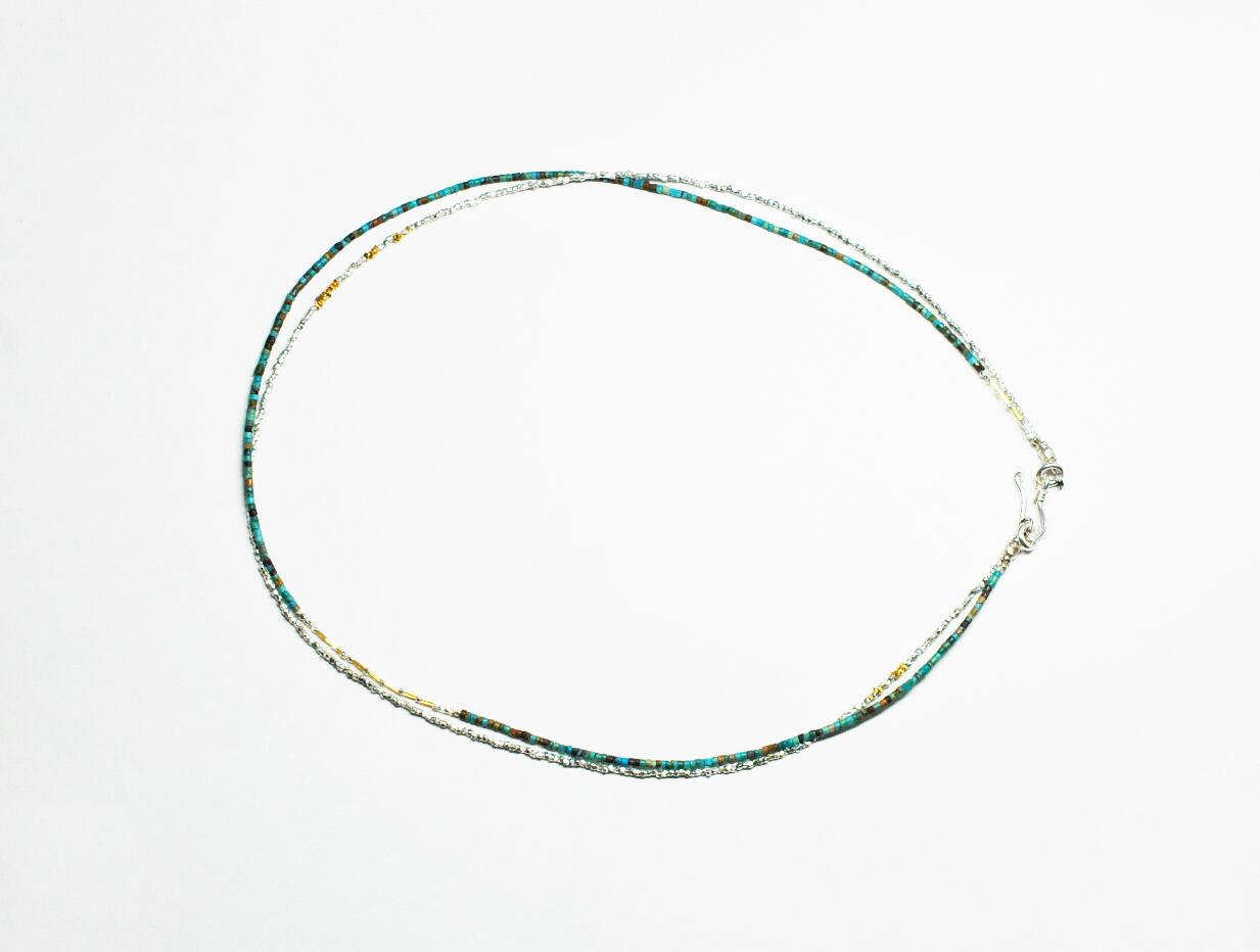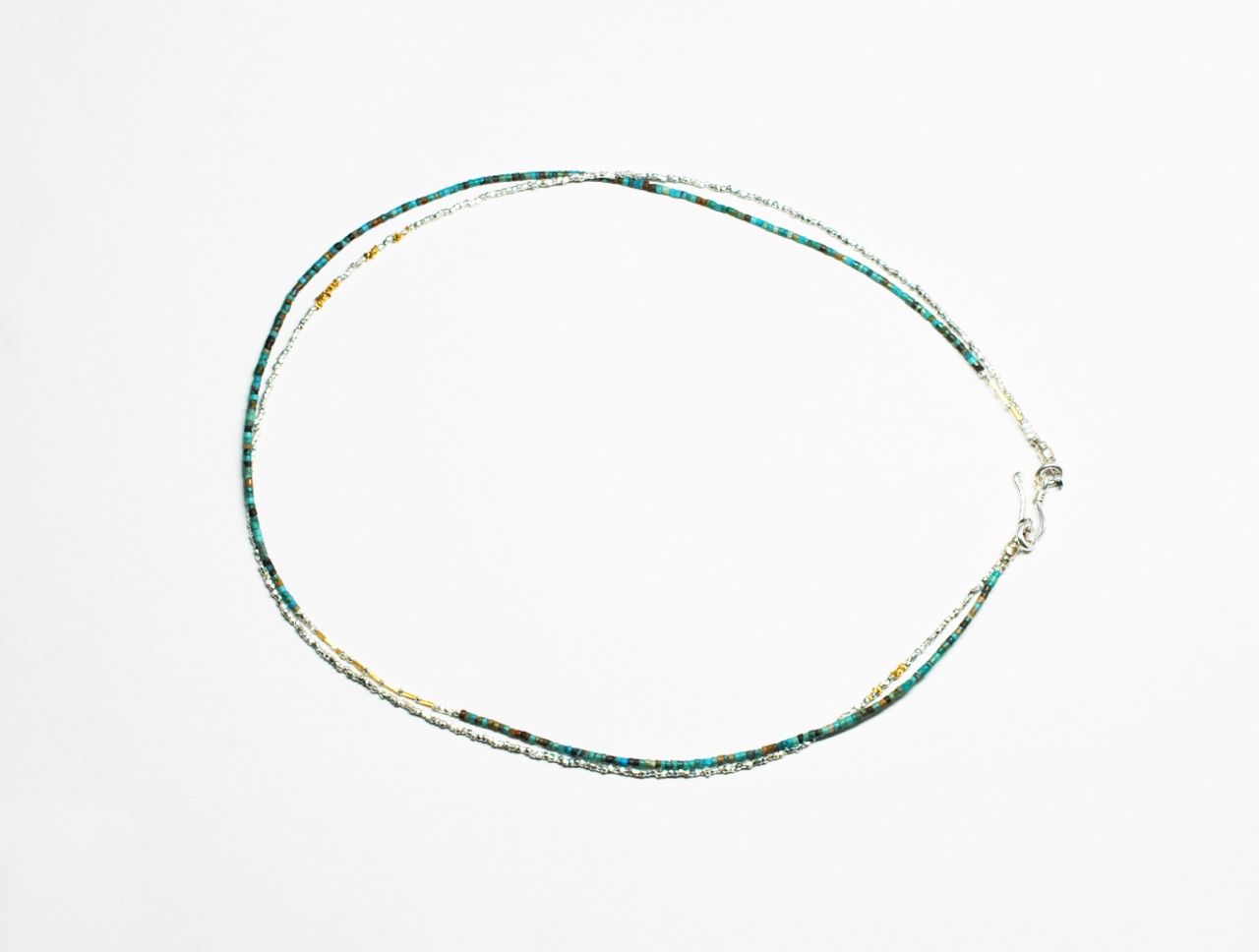 小さなターコイズと、キラキラとしたカレンシルバービーズを繋げた2連のネックレスです。