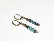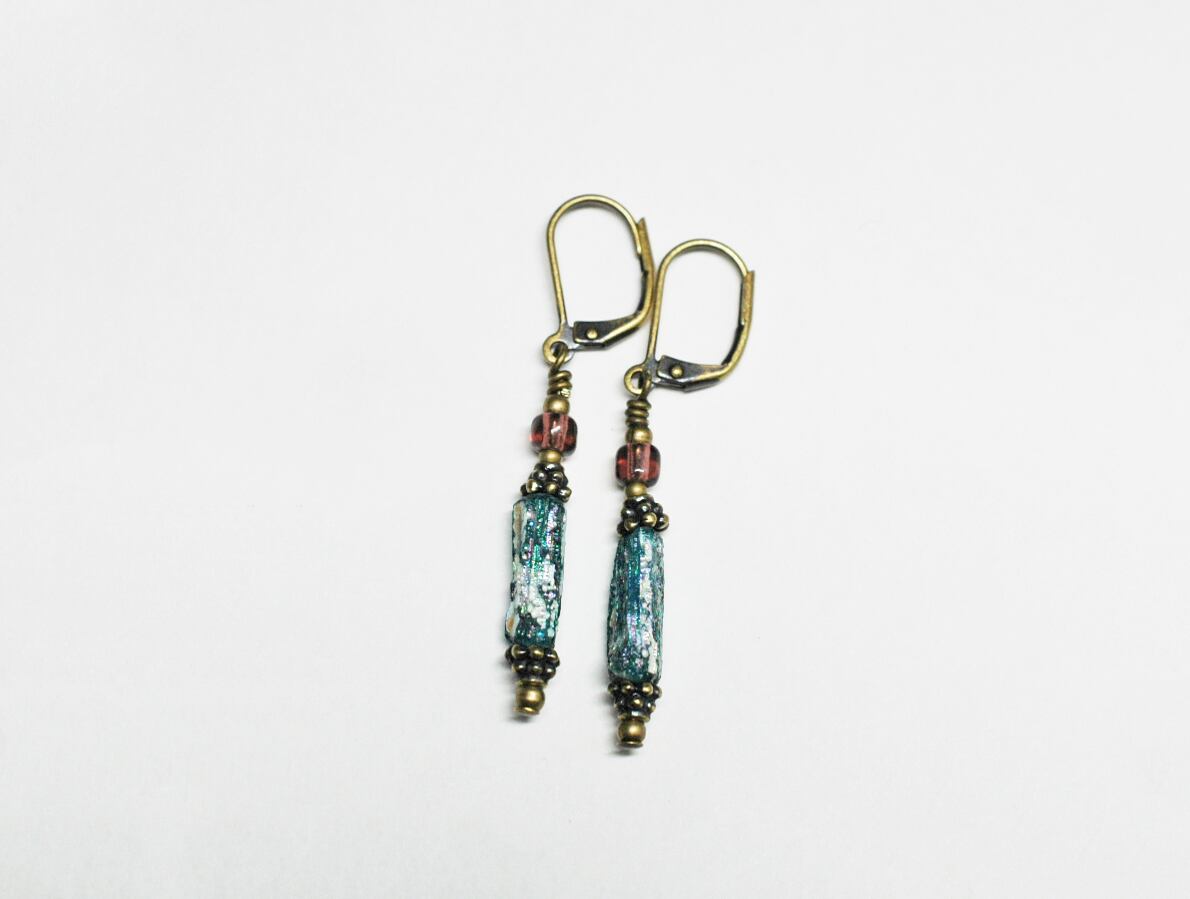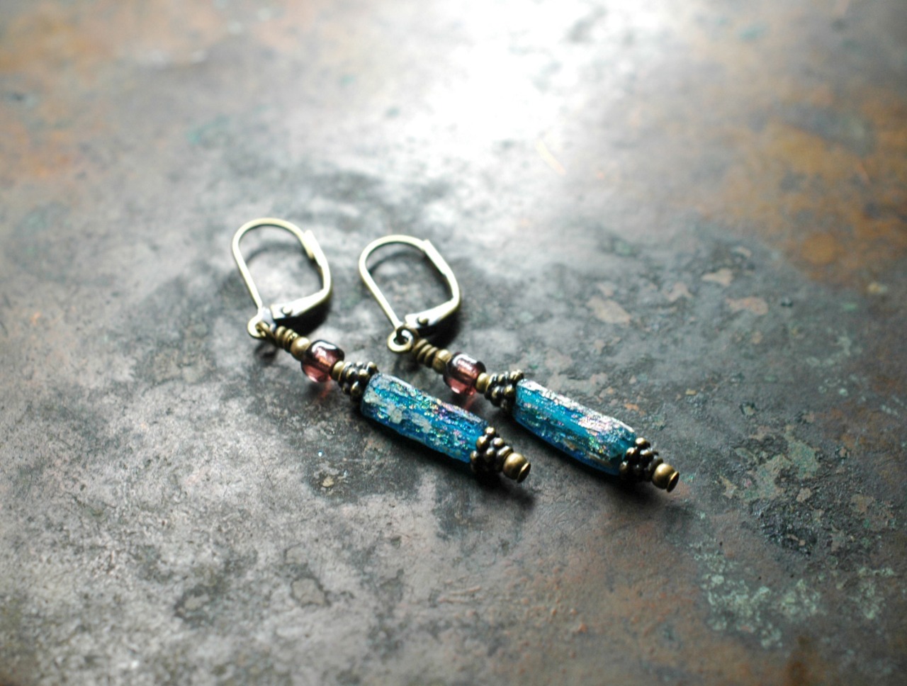 美しく銀化したローマングラスと、紫色のアンティークビーズを繋いだピアスです。