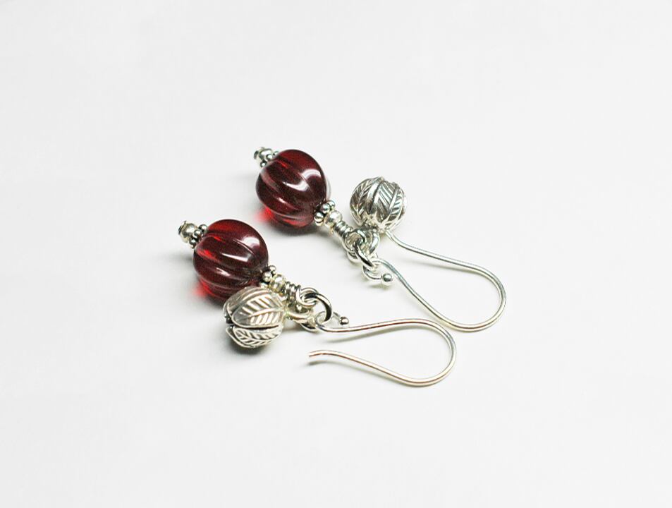 深紅のドイツヴィンテージガラスビーズとカレンシルバーの蕾ピアス