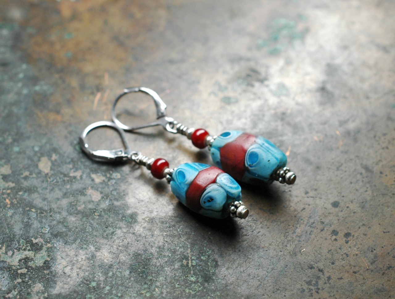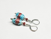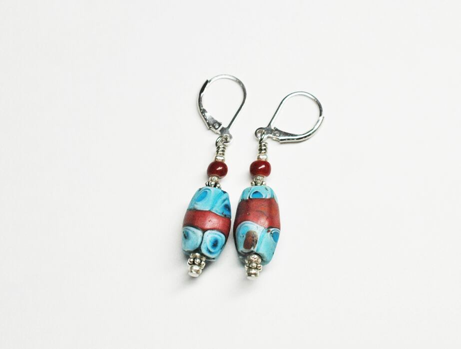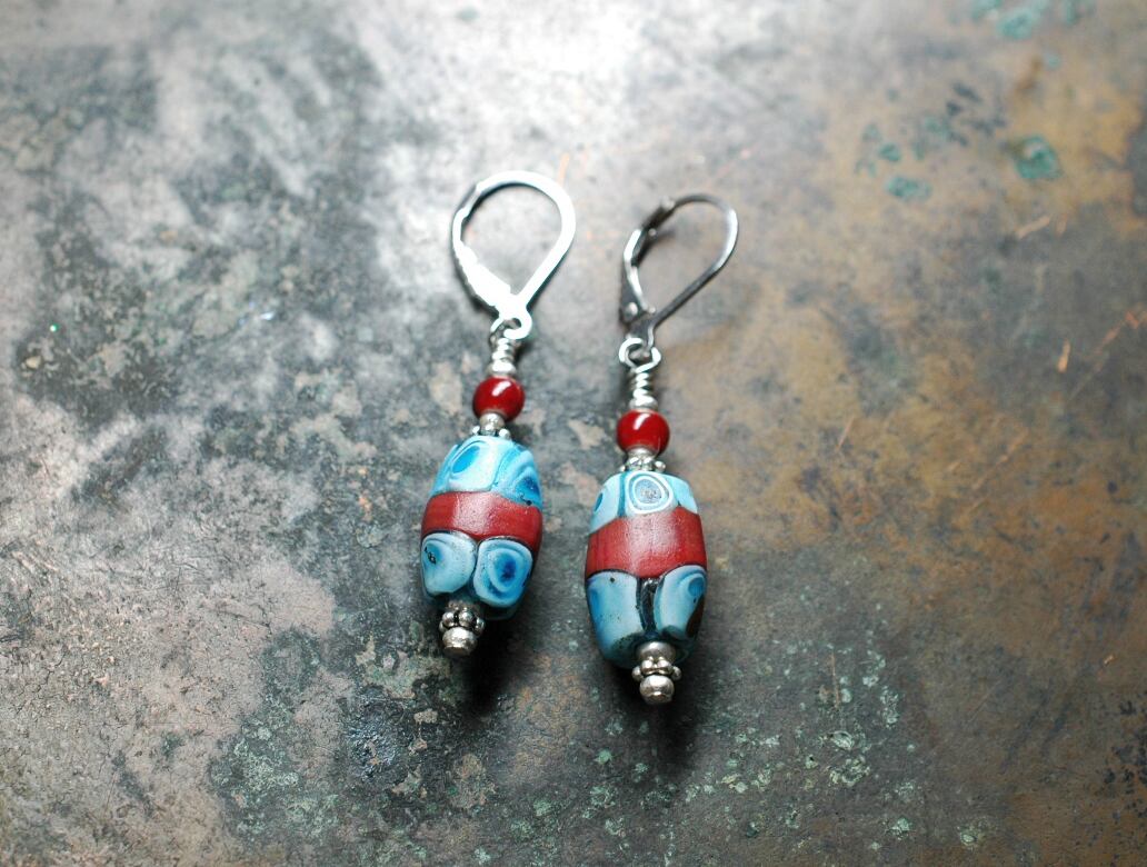 ミルフィオリ(千の華)と呼ばれるアンティークのベネチアビーズ(19~20世紀)と、濃い赤色のホワイトハーツを繋いだピアスです。