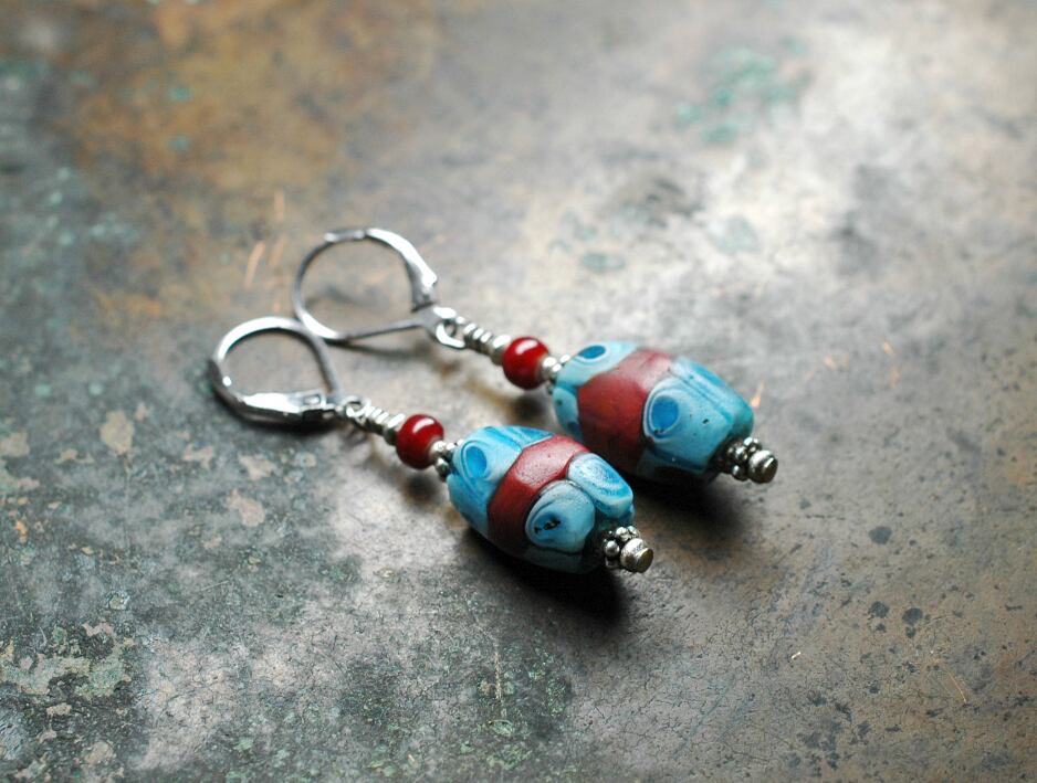いわゆるトレードビーズです。セミクリアブルーとホワイトの多重眼に、濃い赤色の帯が施されています。