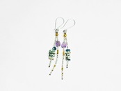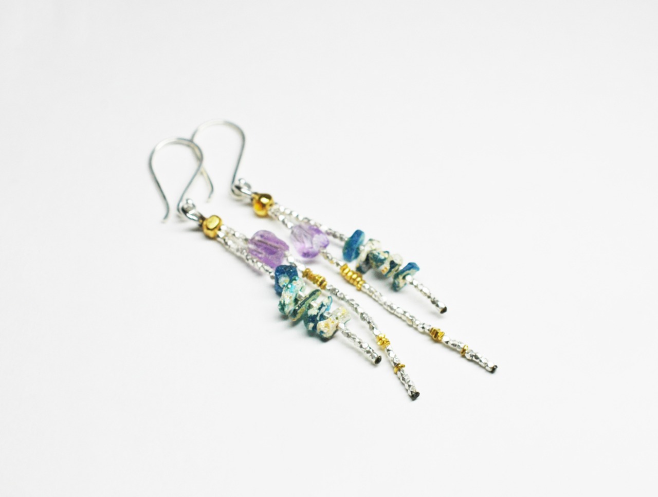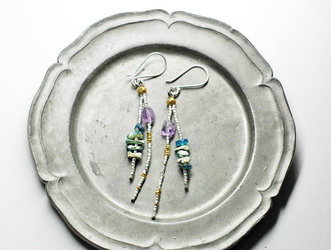 さざれ型のローマングラスと、ラフロックなアメジスト、キラキラとしたカレンシルバービーズを繋いだピアスです。