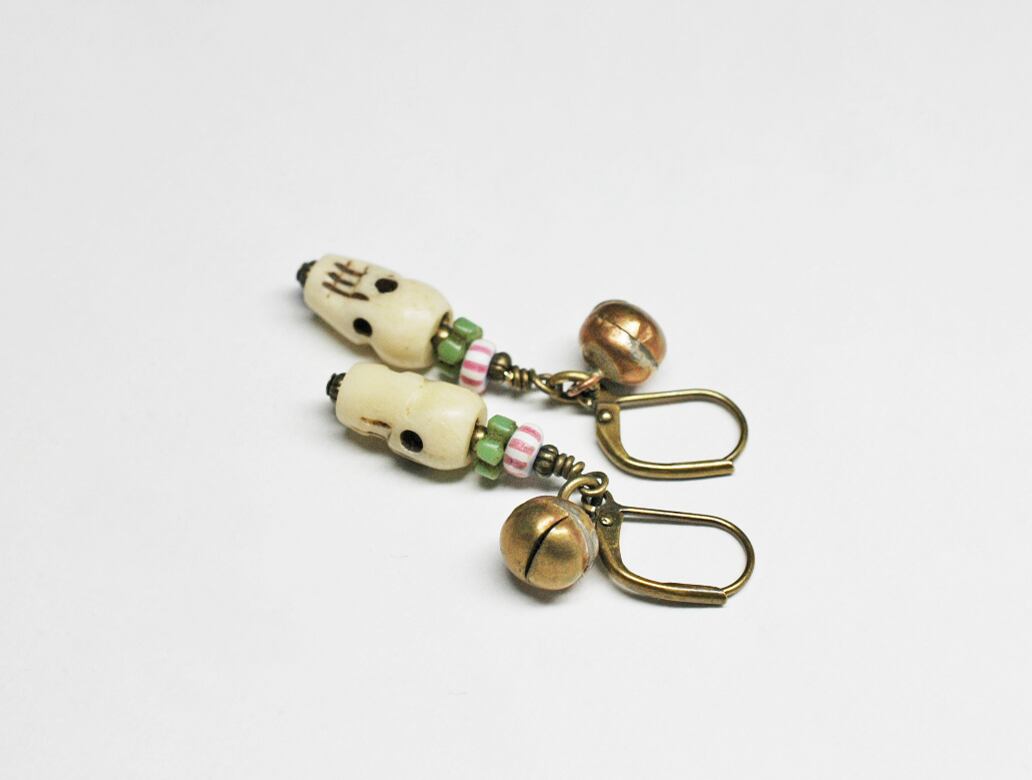 ボーンスカルビーズと、アンティークビーズ、タイの鈴を繋いだピアスです。