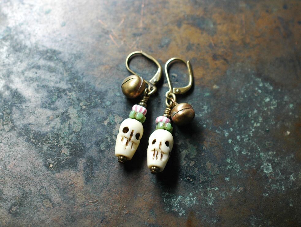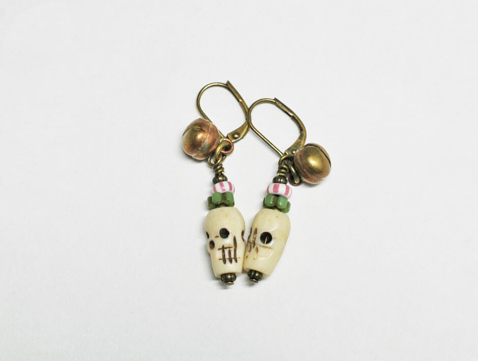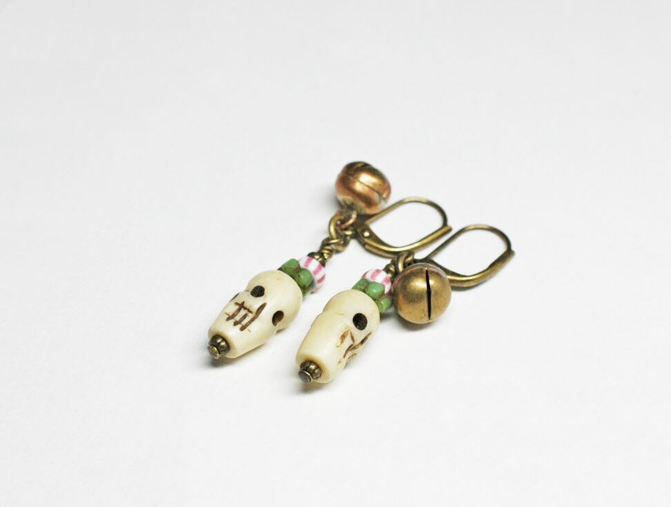 ファニーなボーンスカルとアンティークビーズ、鈴のピアス(グリーン)