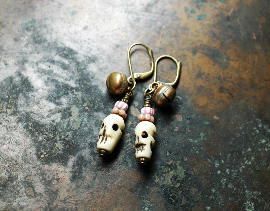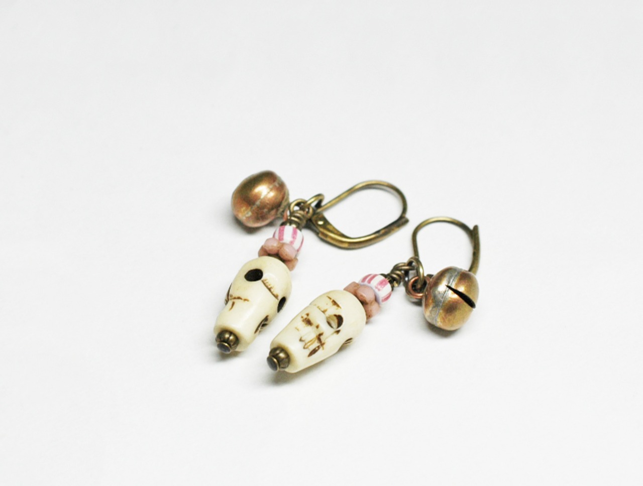 ボーンスカルビーズと、アンティークビーズ、タイの鈴を繋いだピアスです。