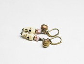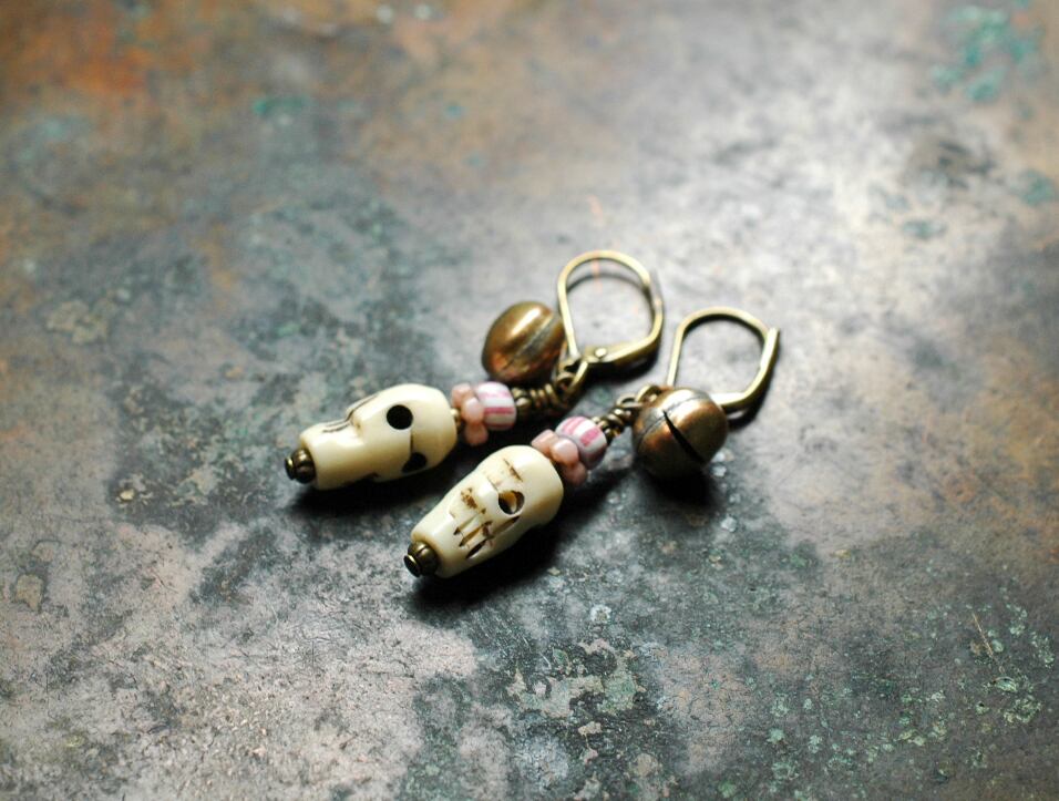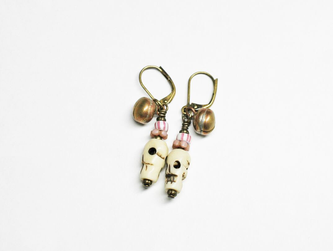 ファニーなボーンスカルとアンティークビーズ、鈴のピアス(ピンク)