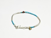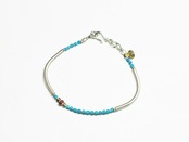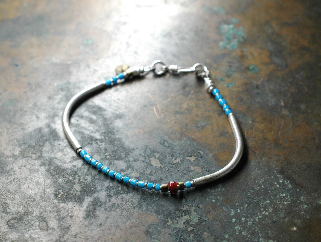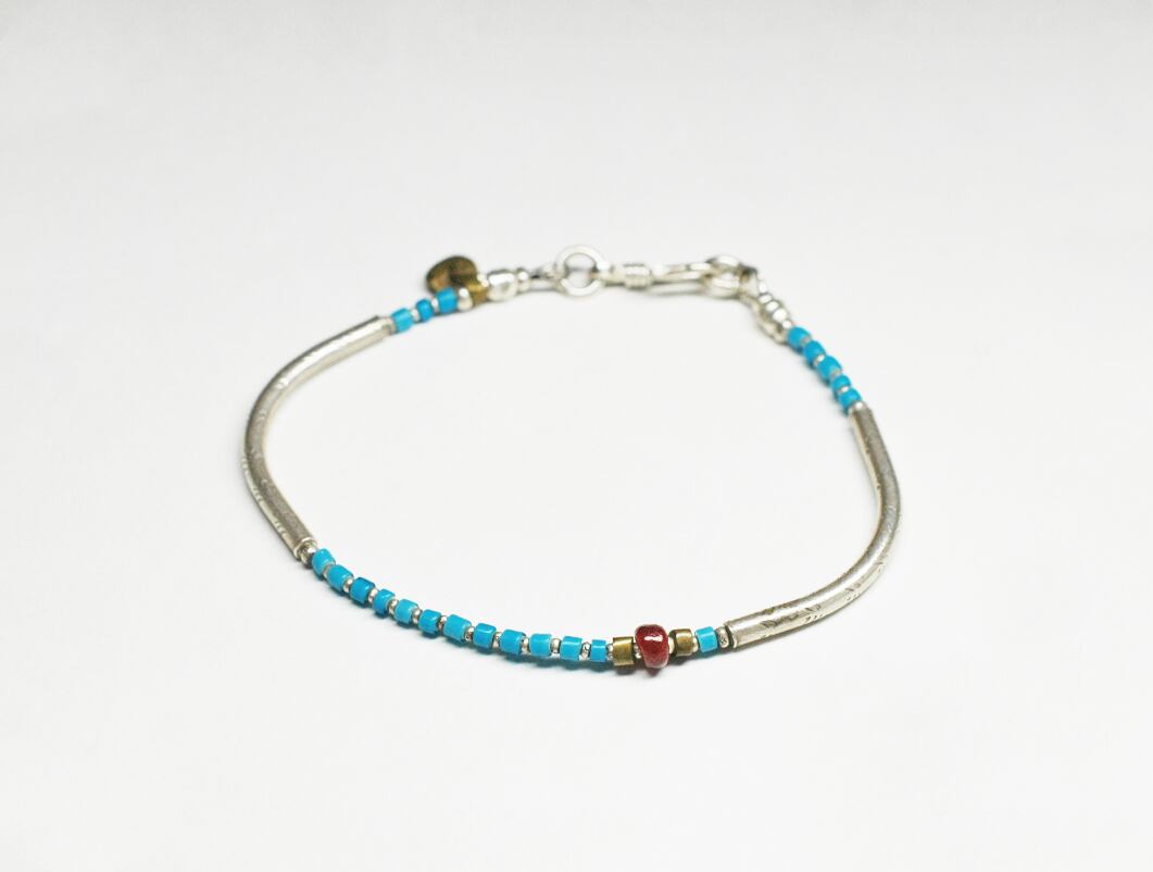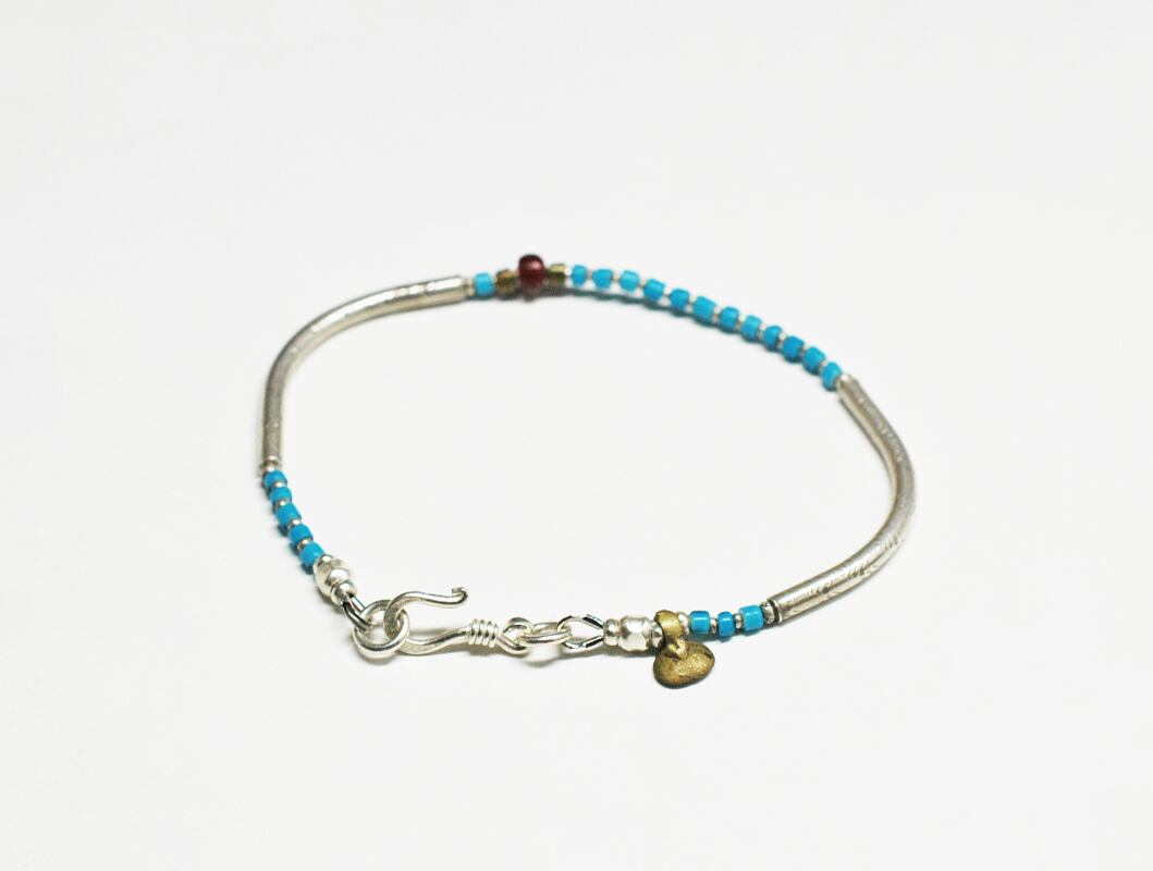 とっても珍しいターコイズ色のホワイトハーツと、九の字のカレンシルバーを繋いだブレスです。