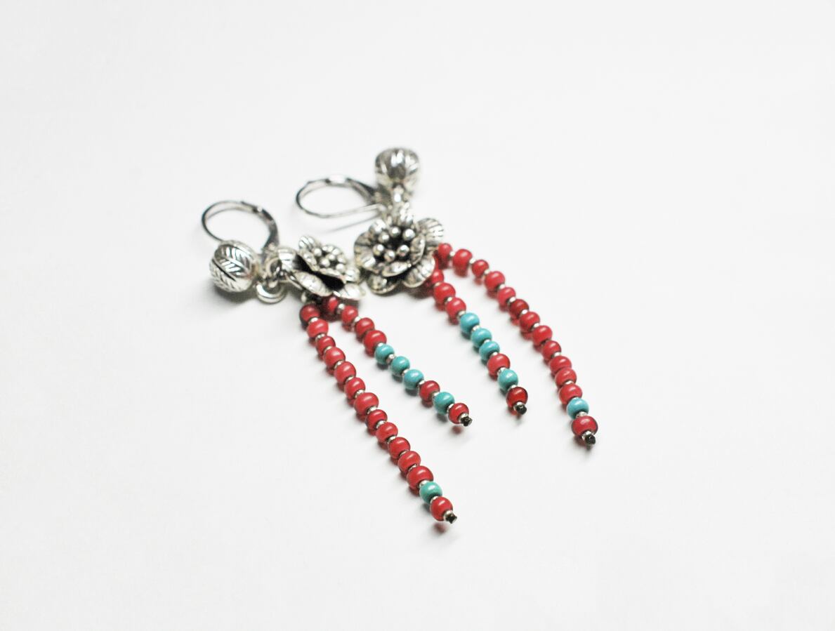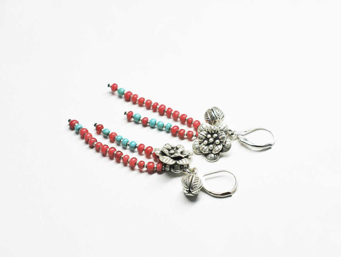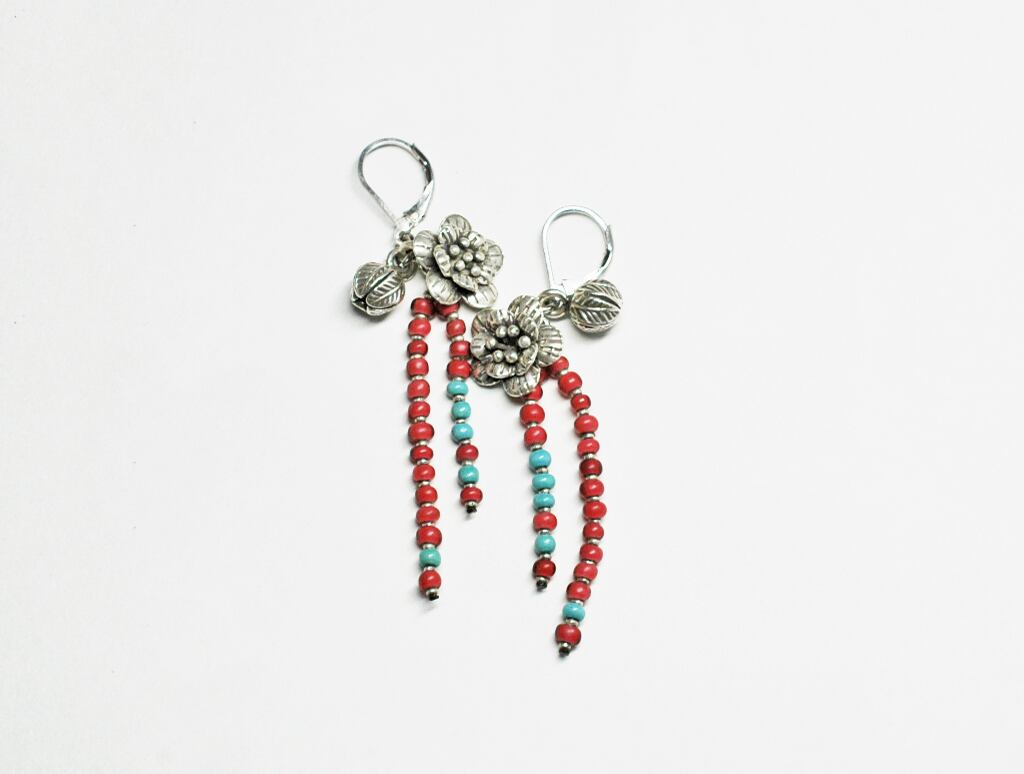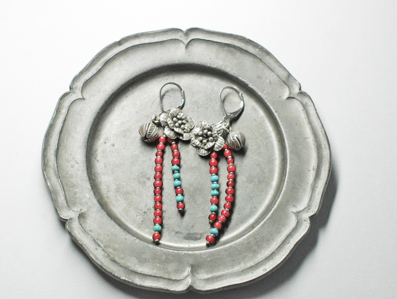 花と蕾のカレンシルバーチャームと、ベネチアのアンティークビーズを繋いだピアスです。