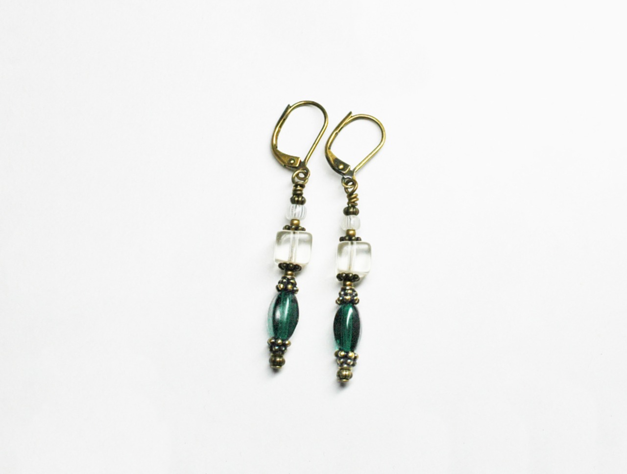 2色のアンティークボヘミアビーズと、小さなベネチアアンティークビーズを繋いだピアスです。