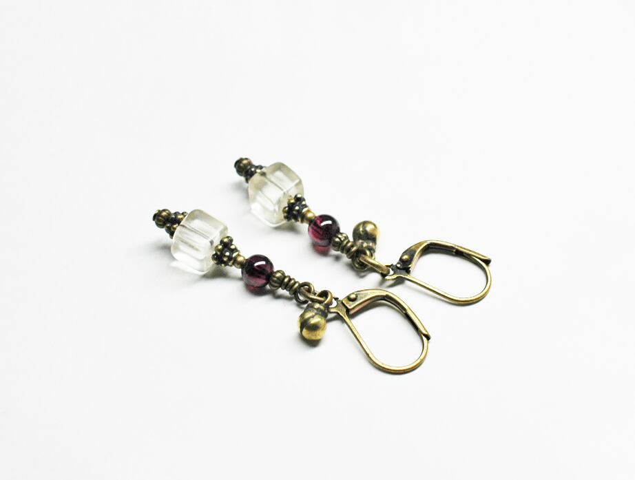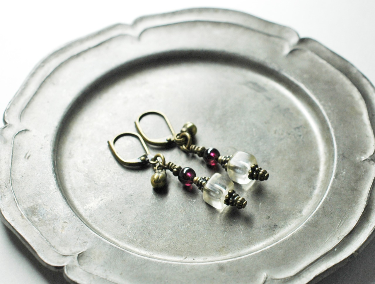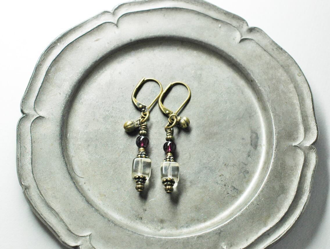 アンティークボヘミアビーズと、小さなガーネット、民族の鈴を繋いだピアスです。