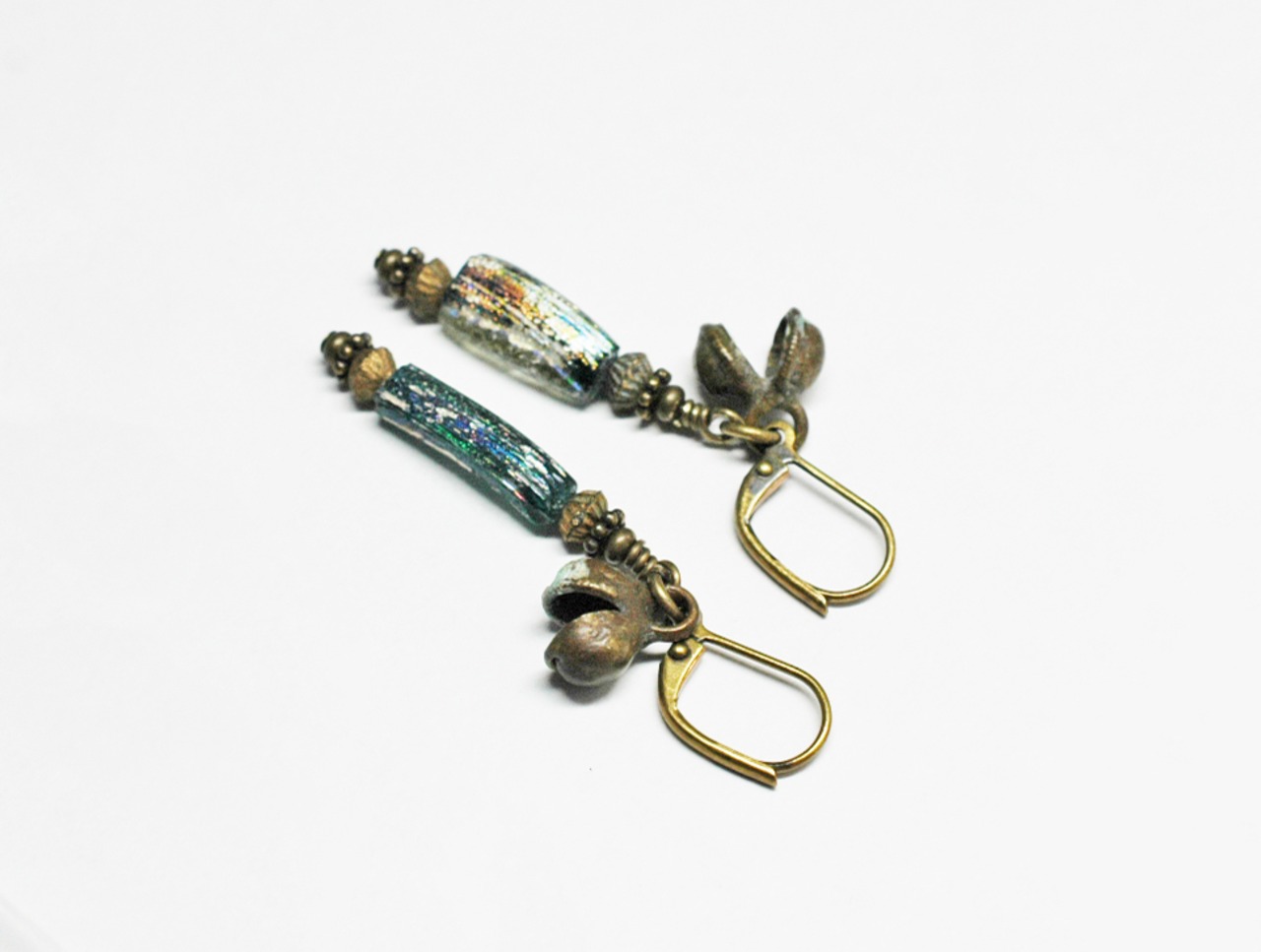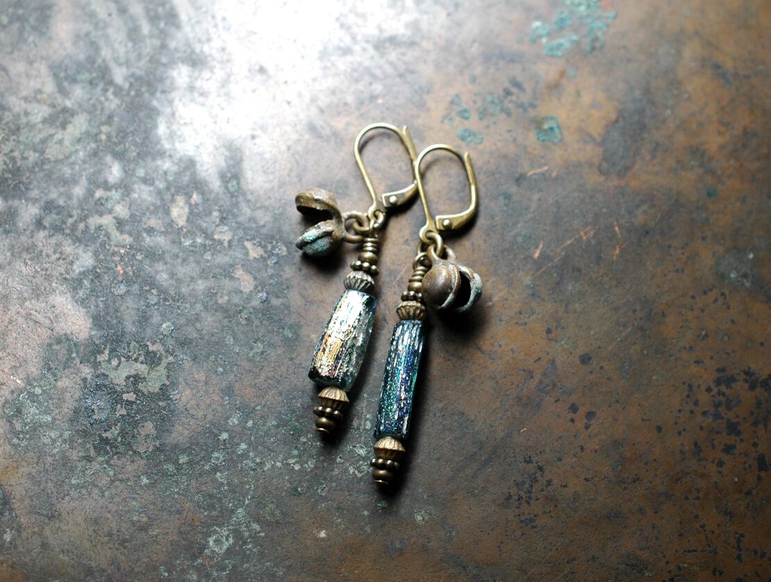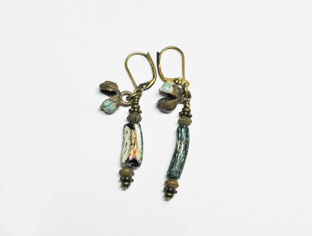 銀化したローマングラスと、ベル型のトライバルを繋いだピアスです。