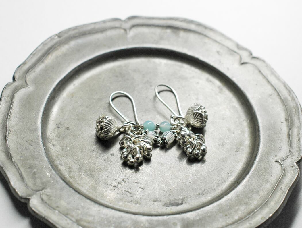丸いお花とたわわなカレンシルバーと、アマゾナイト、アンティークビーズを繋いだピアスです。