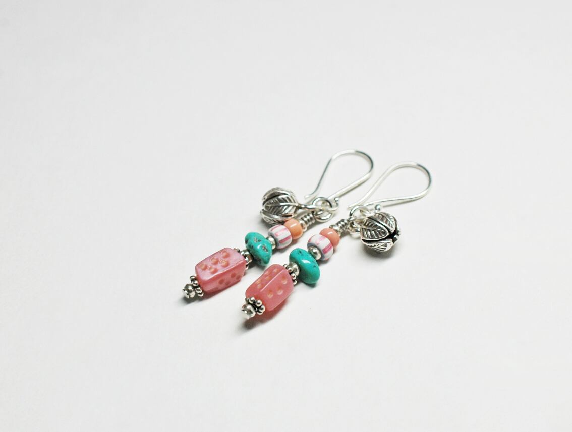 ピンク色のダイスビーズをターコイズと、ベネチアのアンティークビーズ、カレンシルバーのピアスです。
