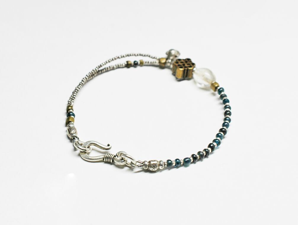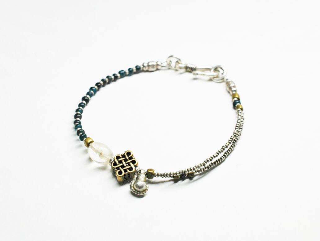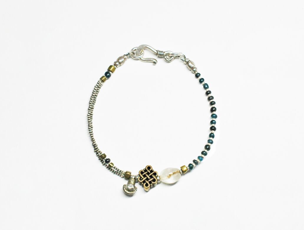 エンドレスノットモチーフと、古代水晶、oldインドシルバーチャームなどをとっても小さなカレンシルバーとインディゴブルーのアンティークビーズで繋いだブレスです。