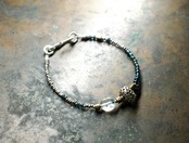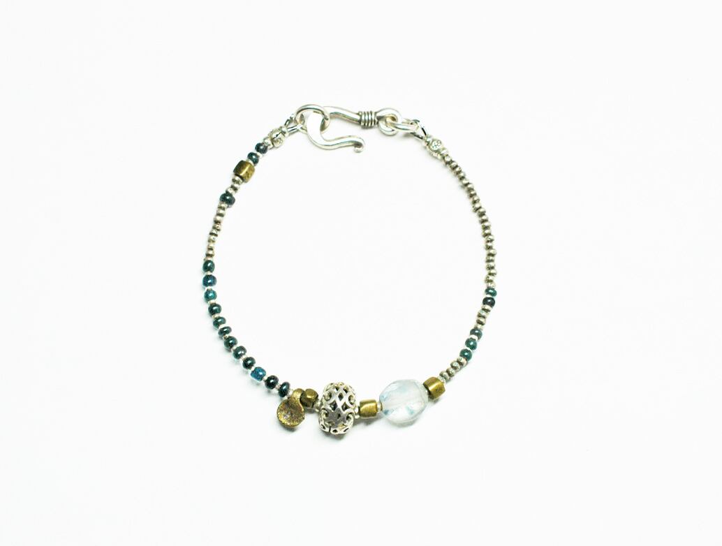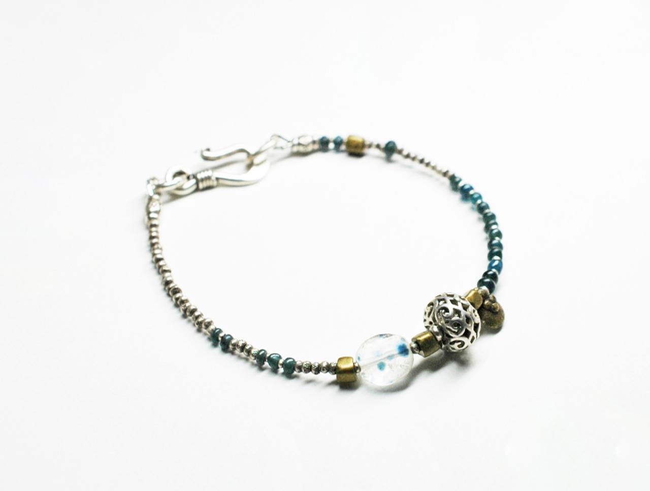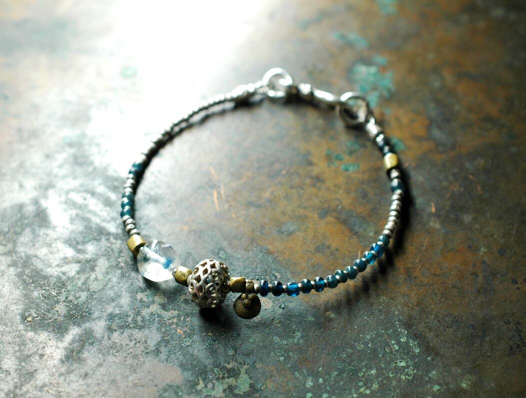 チベットのメタルビーズと古代水晶、oldオリッサブラス、インディゴブルーのアンティークビーズ、カレンシルバーを繋いだブレスです。