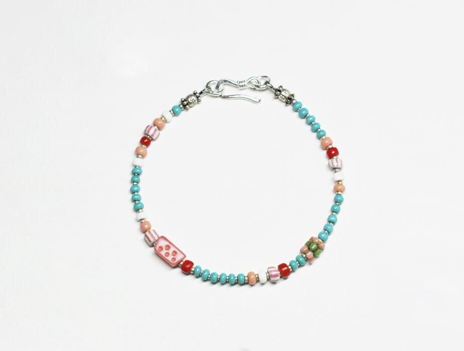 多彩なベネチアビーズと、ピンク色のダイスビーズ、フラワービーズを繋いだブレスです。