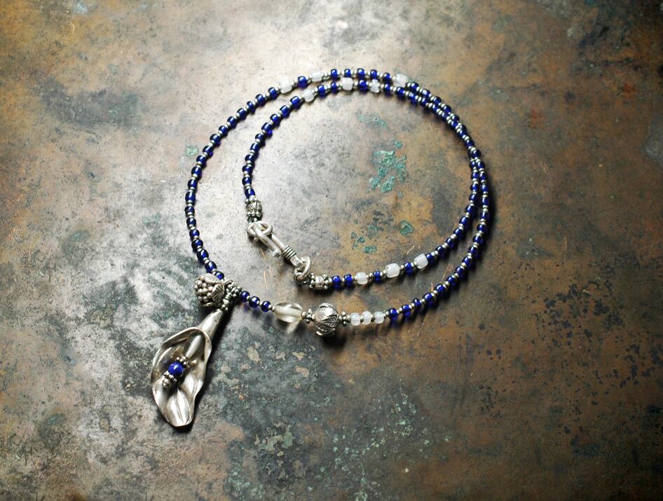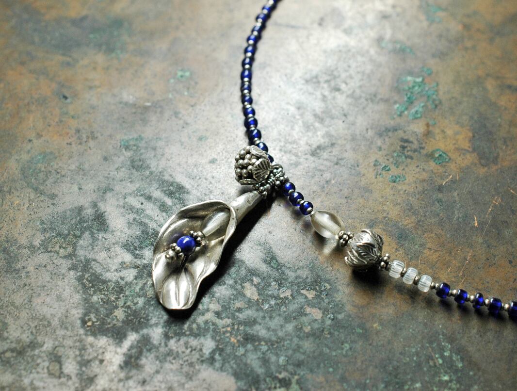 カラーのような花にはラピスと透明なアンティークのボヘミアビーズをあしらっています。首元の透明な楕円型ビーズも同等のボヘミアビーズです。