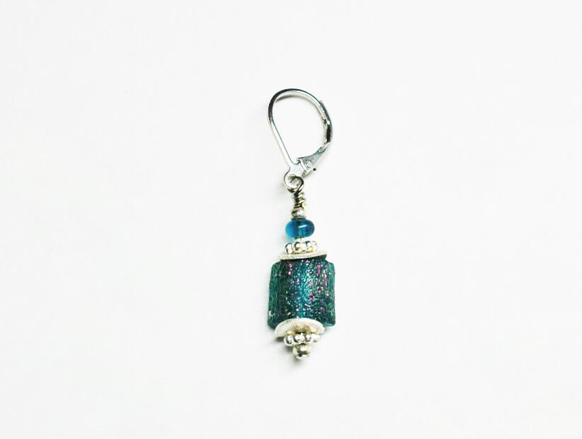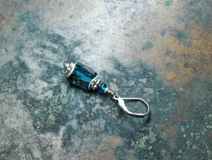 ブルーグリーン色ローマングラスと小さなアンティークビーズをシルバーで繋いだ片耳だけのピアスです。