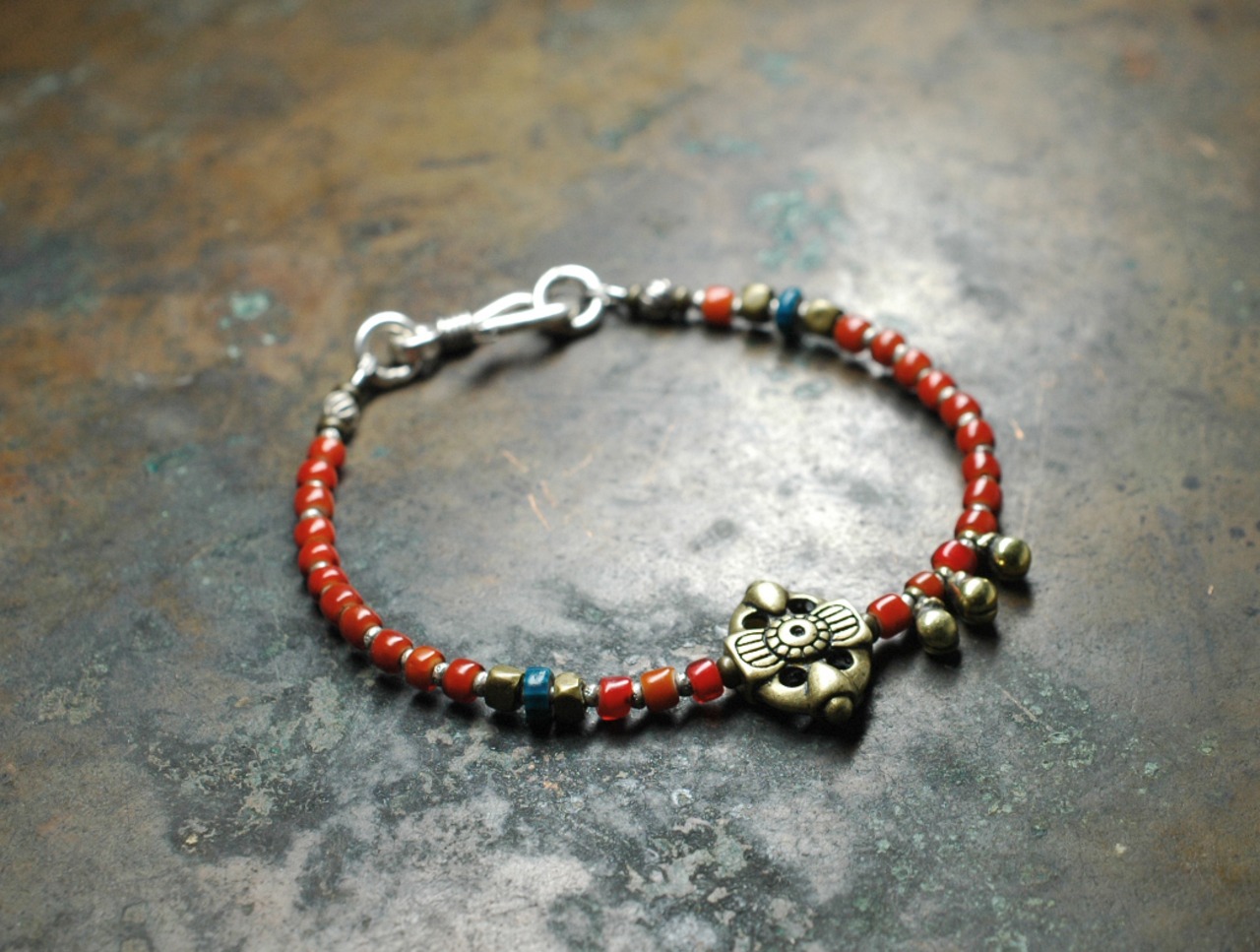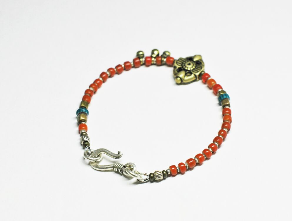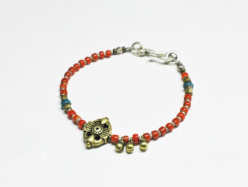 チベットから届いたブラスパーツと、アンティークのワイトハーツ、民族鈴などを繋いだブレスです。
