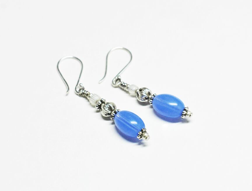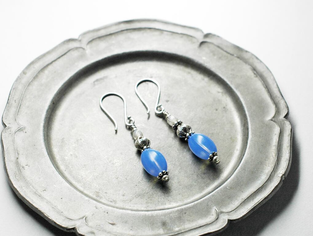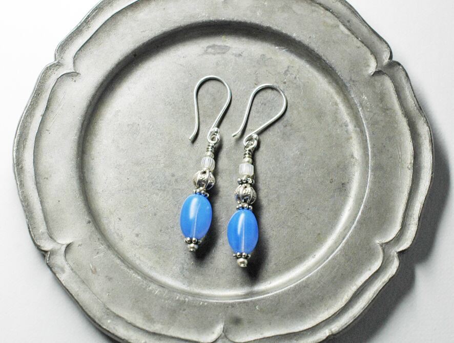 青藤色のアンティークビーズろ、カレンシルバーを繋いだピアスです。