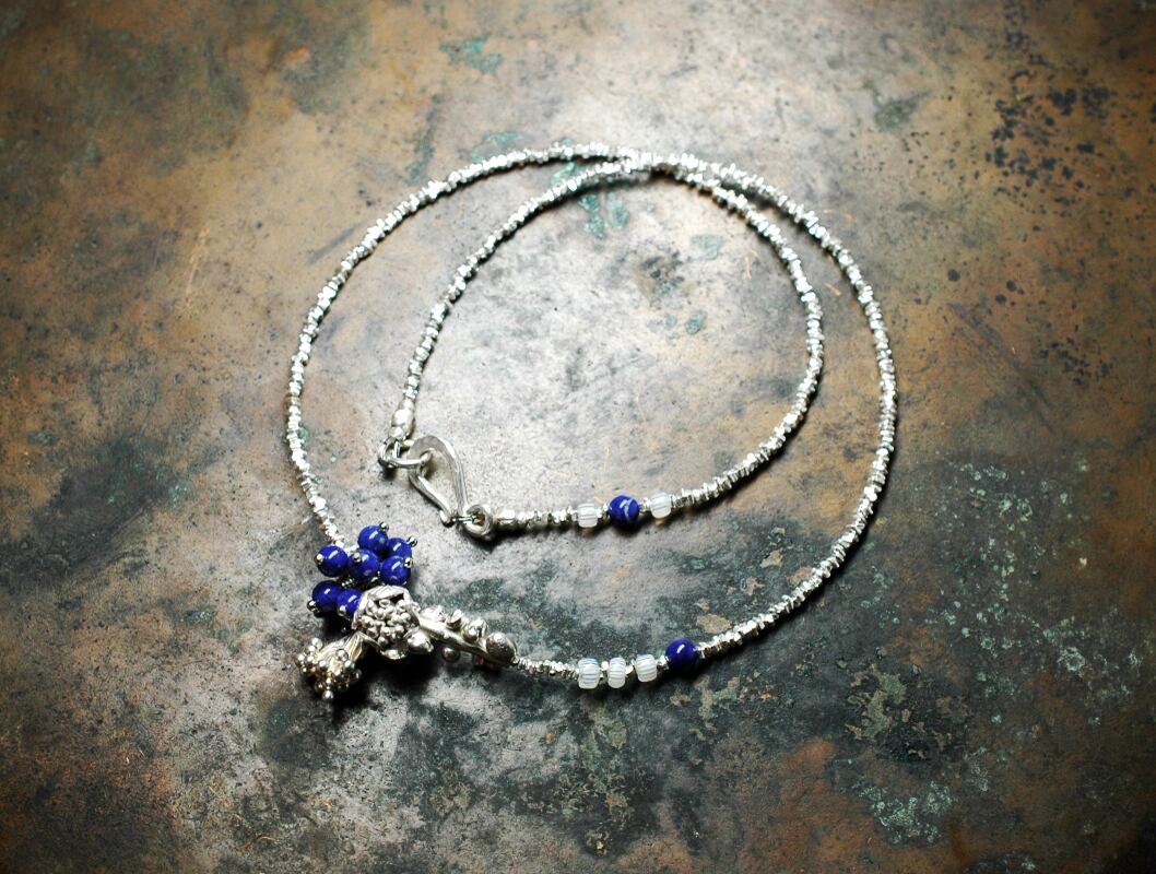 たわわなラピスラズリ、蕾のようなコロンとしたものと、つぶつぶの蕾のようなカレンシルバーチャームを煌めくカレンシルバービーズで繋いだネックレスです。