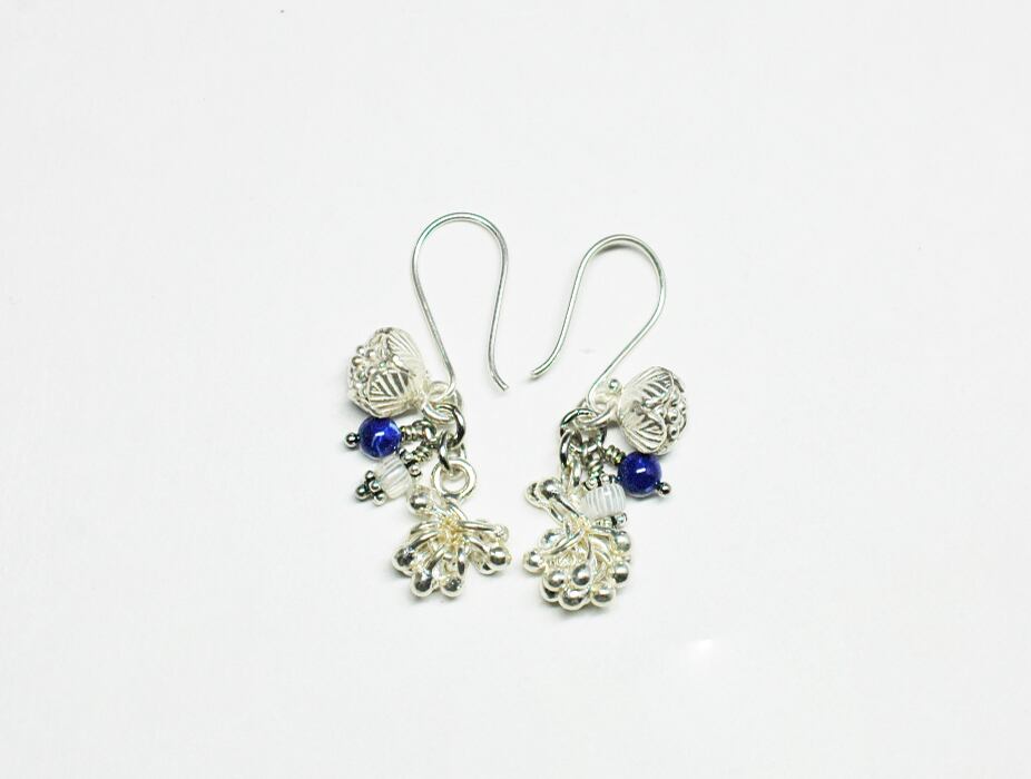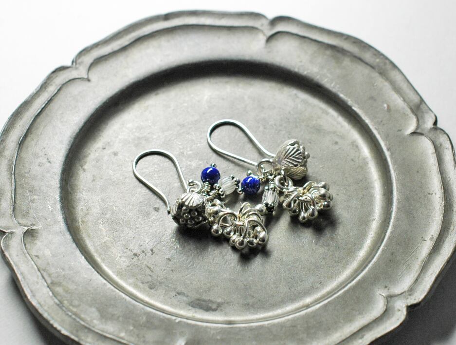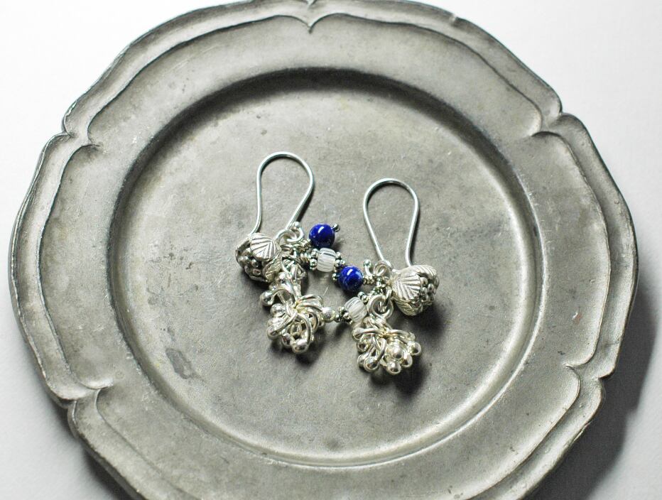 丸いお花とたわわなカレンシルバーと、ラピスラズリ、アンティークビーズを繋いだピアスです。