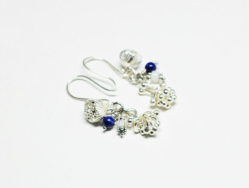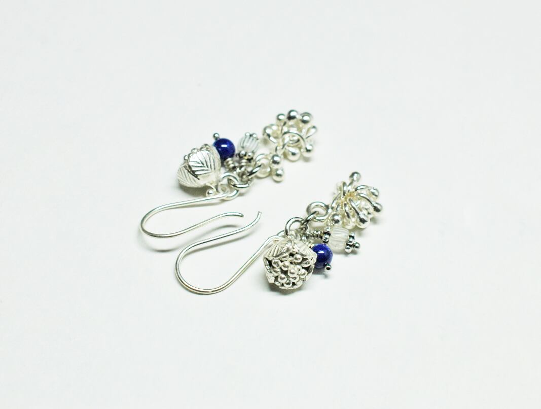 コロンと丸いお花とたわわなカレンシルバーとラピスラズリ、グーズベリーのピアス