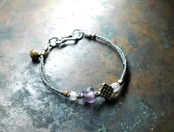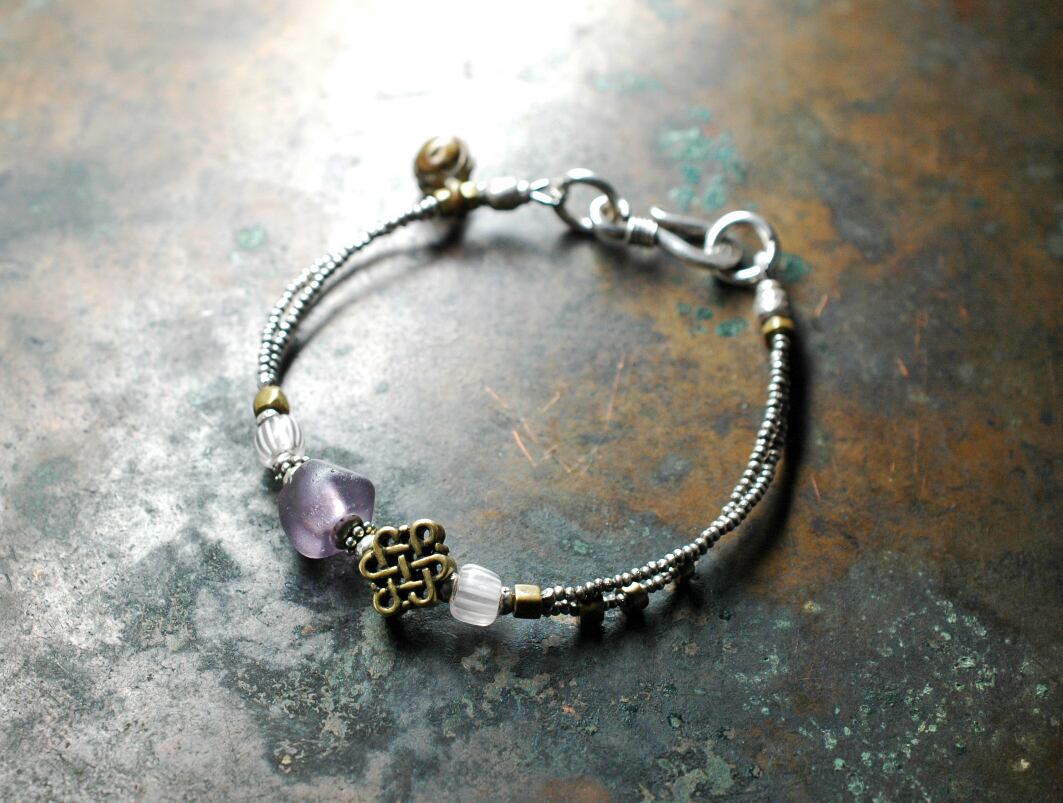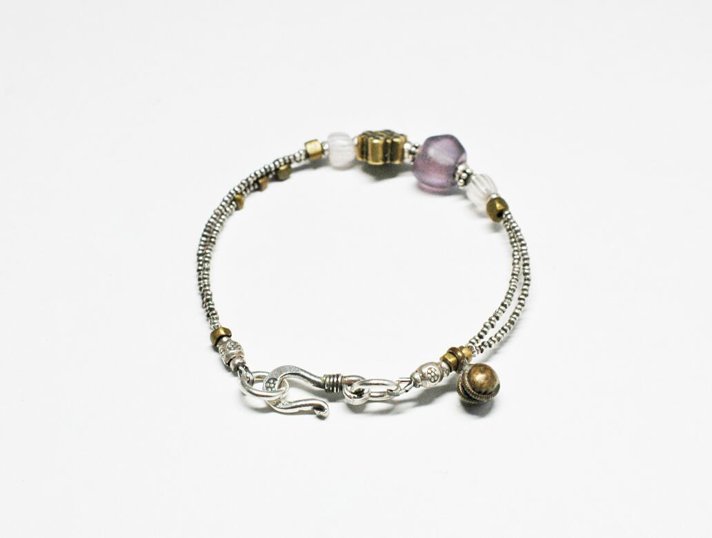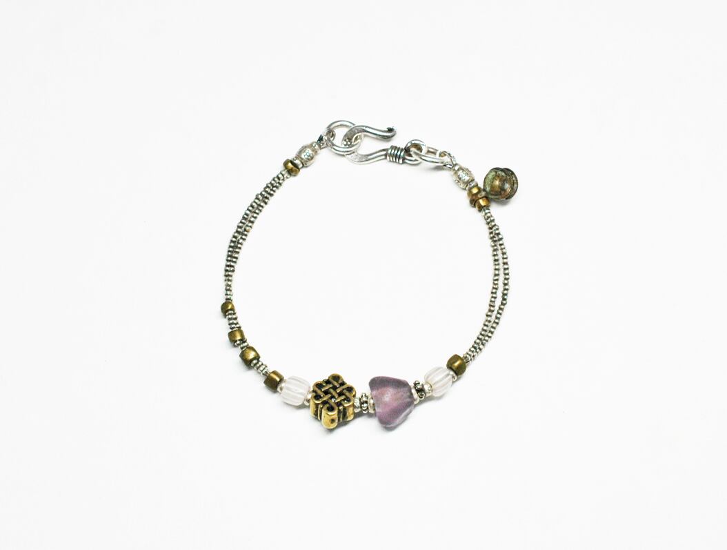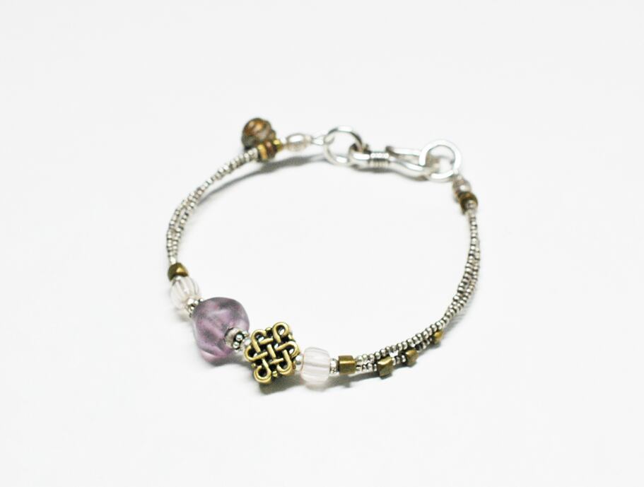 エンドレスノットモチーフと、ドゴン族の紫色のビーズ、グーズベリー、oleオリッサブラスを、小さなカレンシルバービーズで繋いだ2連ブレスです。