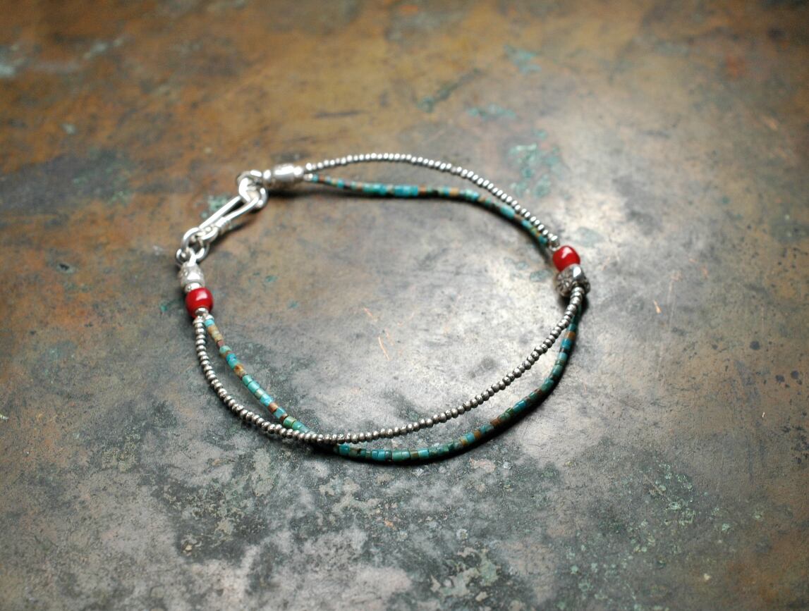 とっても小さなターコイズと、とっても小さなカレンシルバービーズなどを繋げた2連のブレスです。