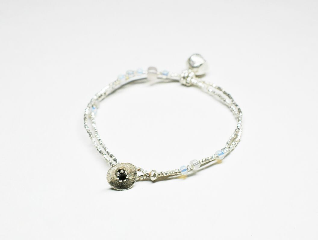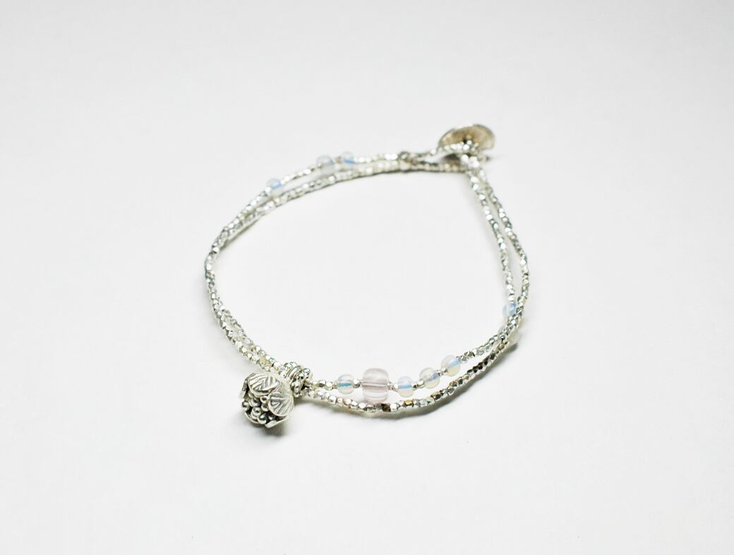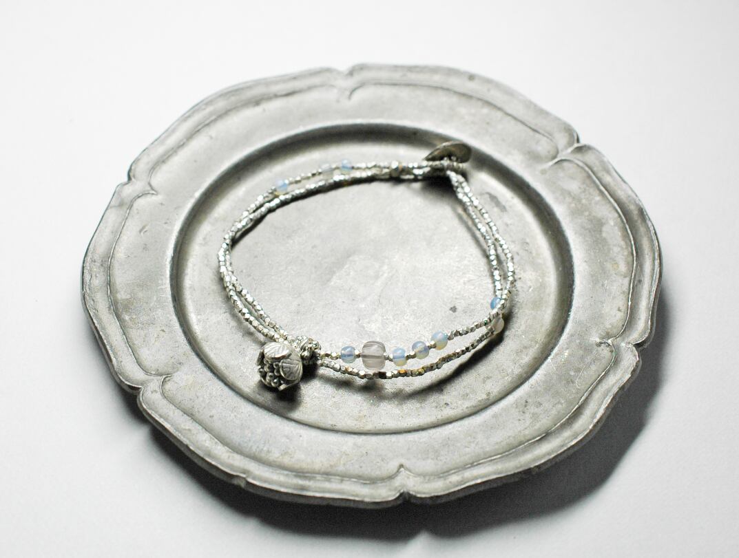 コロンと丸いカレンシルバーチャームと、グーズベリー、オパールガラスを煌めくカレンシルバービーズで繋いだ2連のブレスです。