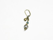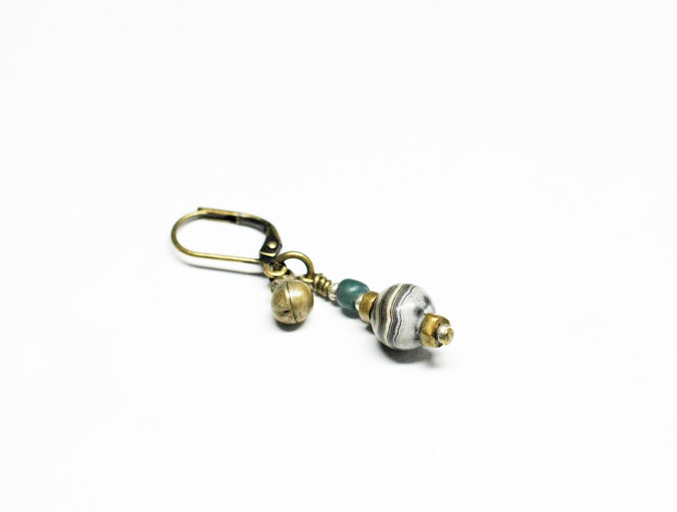 古代瑪瑙、灰青色ビーズ、oldオリッサブラスを、小さなカレンシルバー、民族の鈴を繋げた片耳のみのピアスです。