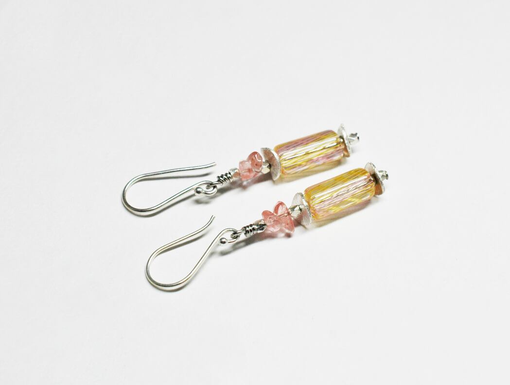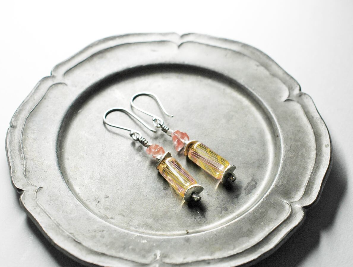 アメリカから届いたビーズに、チェリークォーツとカレンシルバーを繋いだピアスです。