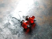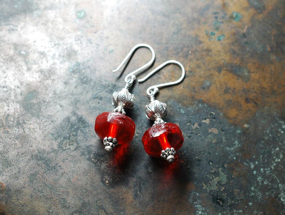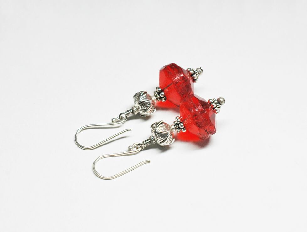真っ赤な算盤型アンティークボヘミアビーズとカレンシルバーのピアス