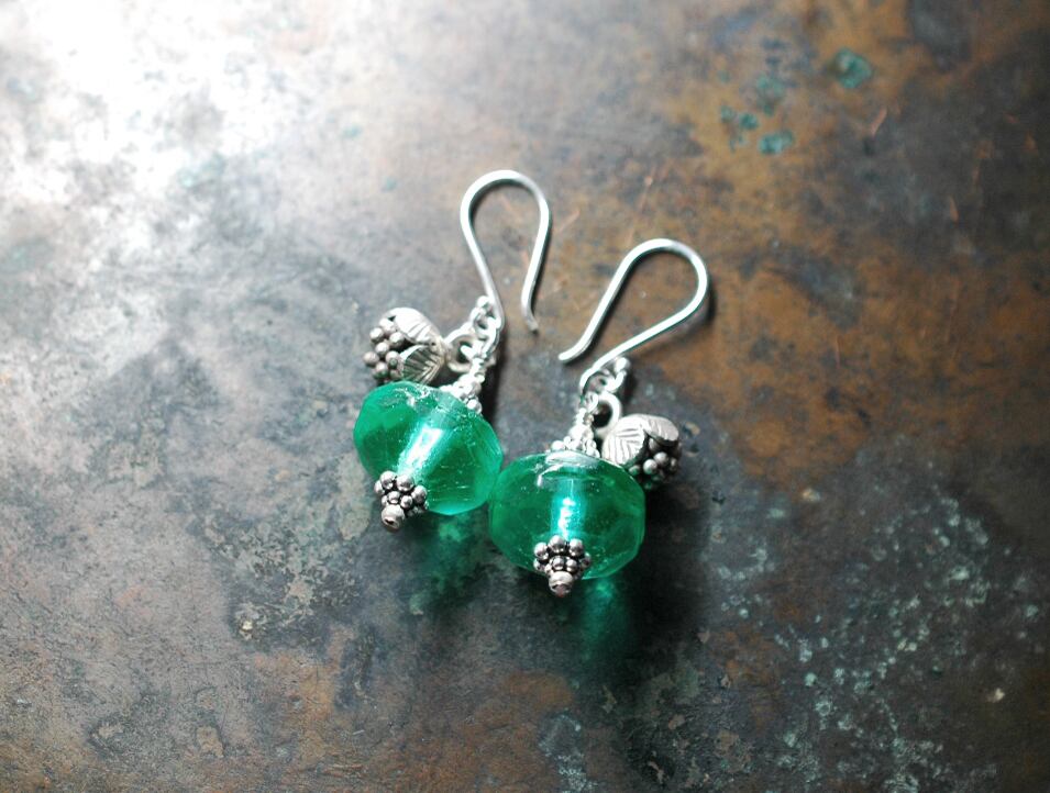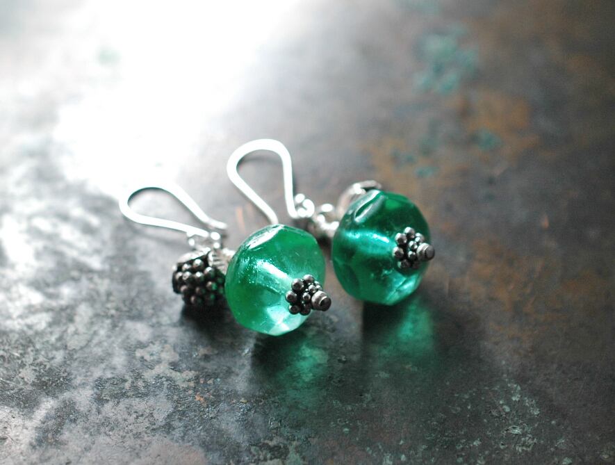 独特なセミクリアグリーンのビーズは、極々微量のウランで発色させています。ブラックライトを当てると光ります!