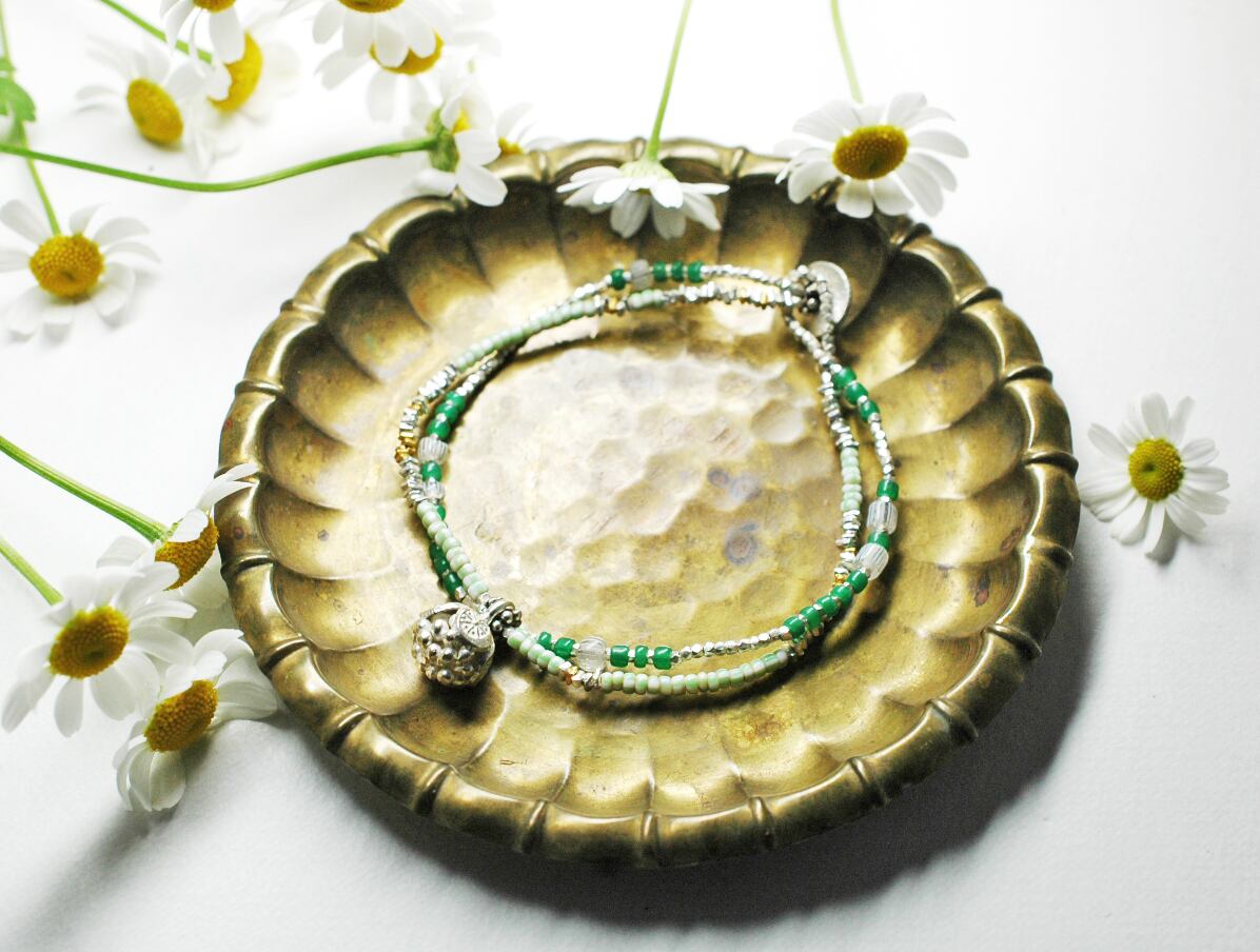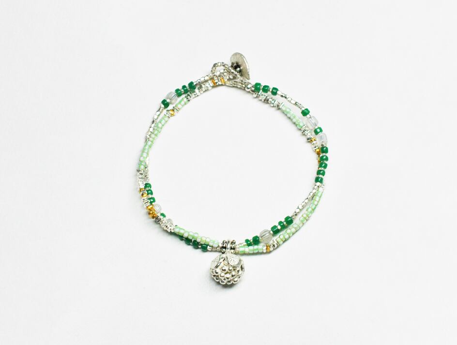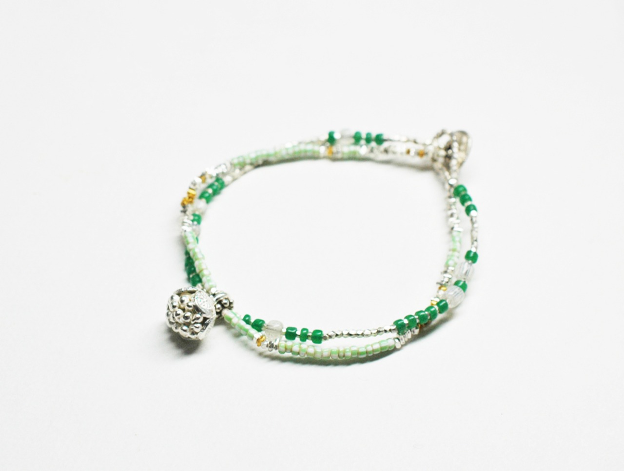 コロンとしたチャームと、小さなカレンシルバービーズ、2種類のグリーンンティークビーズを繋げた2連のブレスです。