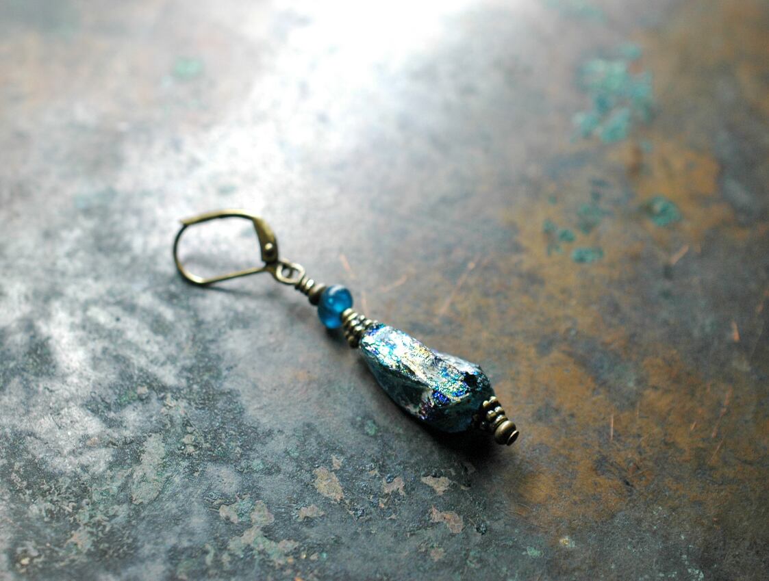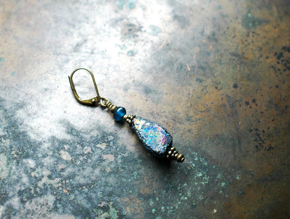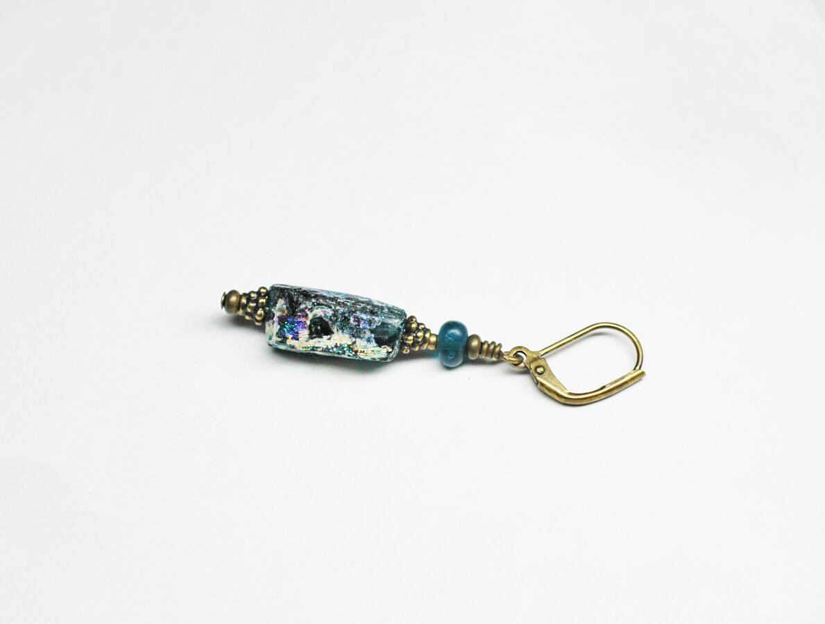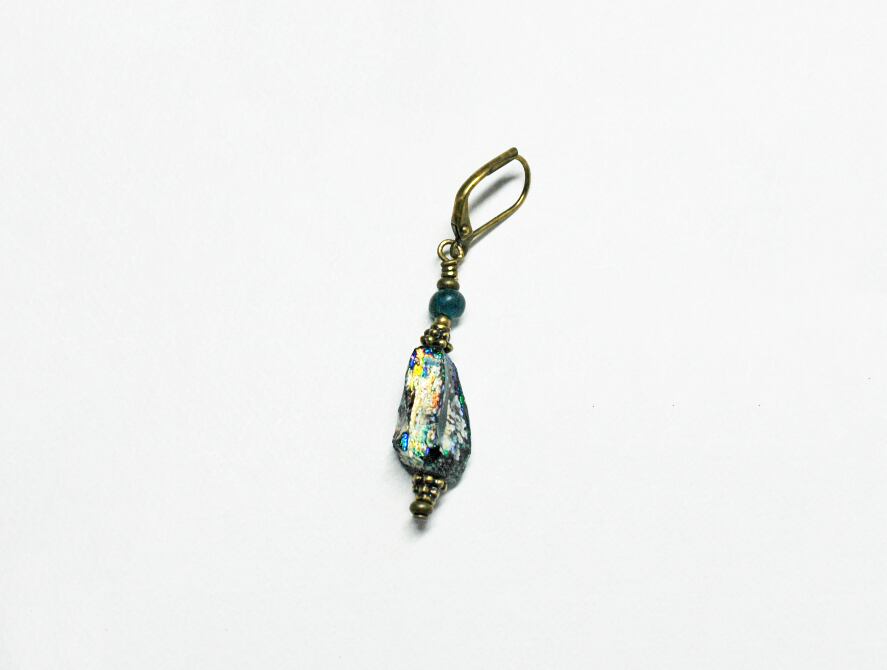 ブルーグリーン銀化ローマングラスとインディゴブルービーズの片耳ピアス