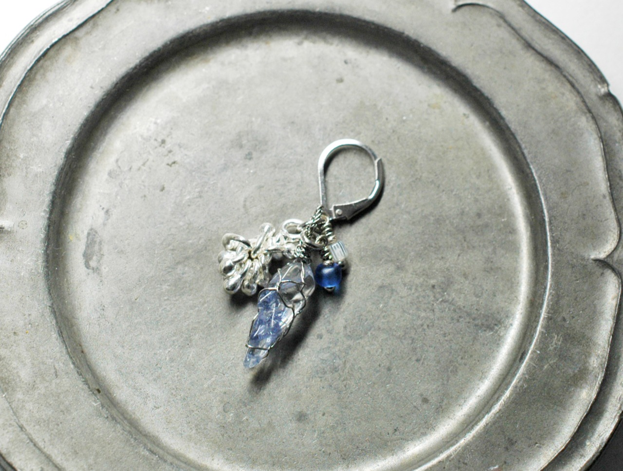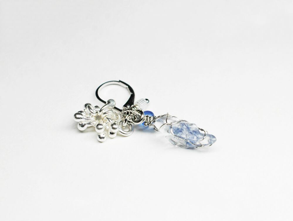 デュモルチェライトインクォーツと、しゃらりとしたカレンシルバチャーム、アンティークビーズを繋いだ片耳のピアスです。