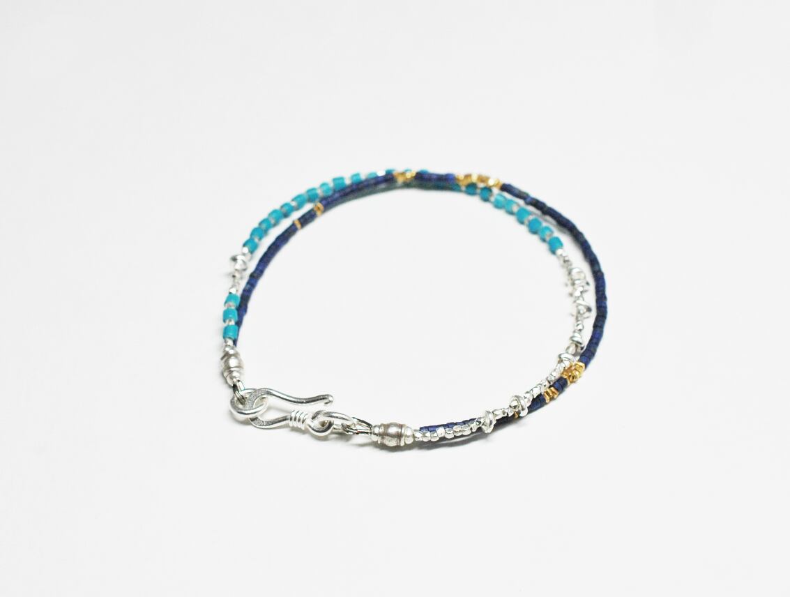 とっても小さなビーズを繋げています。華奢なデザインですがキラキラとしたカレンシルバーとラピスの深い色合いが目を惹きます。