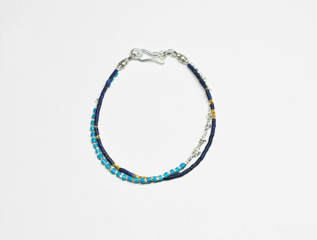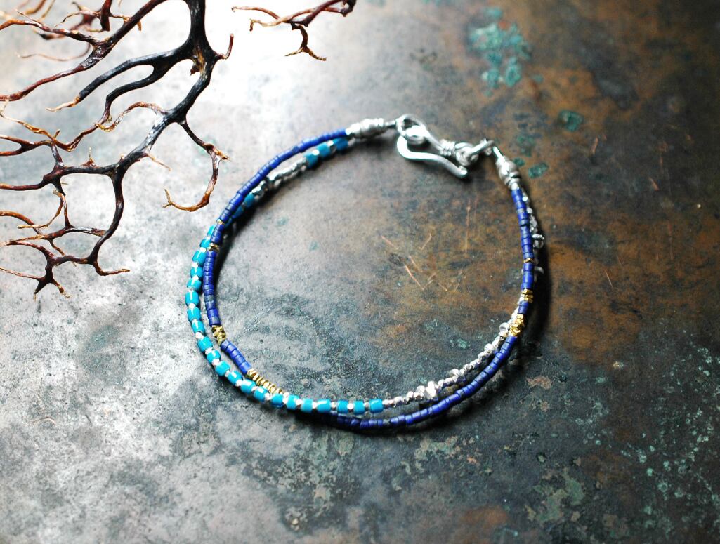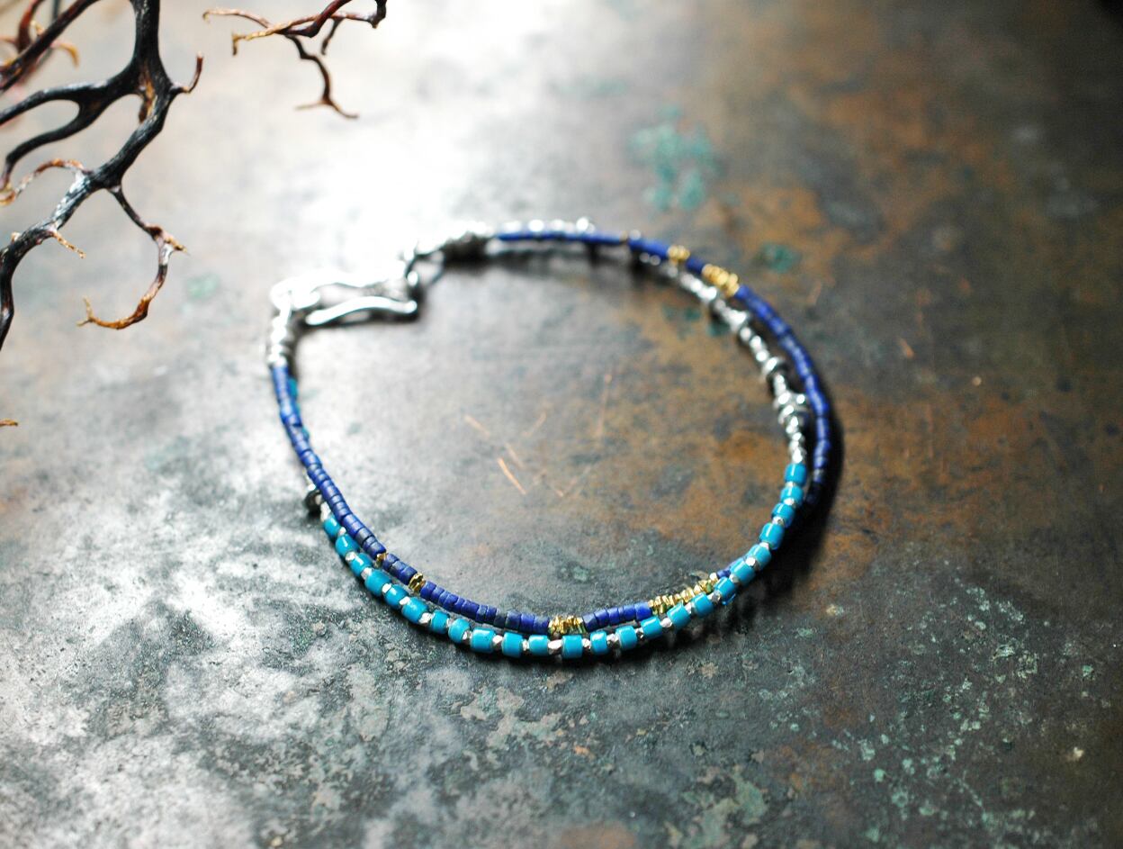 ターコイズブルーのホワイトハーツ、小さなラピスラズリと、キラキラとしたカレンシルバービーズを繋げた2連のブレスです。