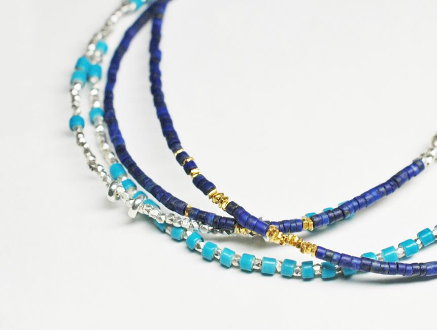 ターコイズブルーのホワイトハーツ、小さなラピスラズリと、キラキラとしたカレンシルバービーズを繋げた2連のネックレスです。