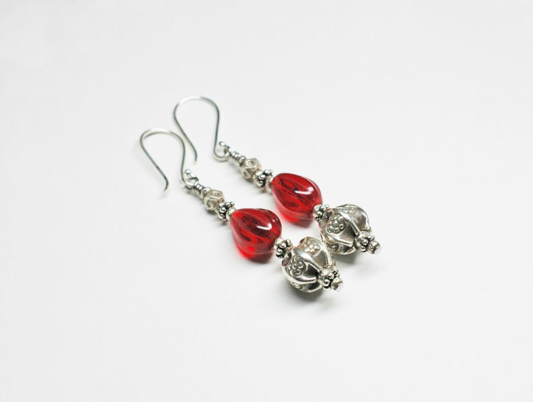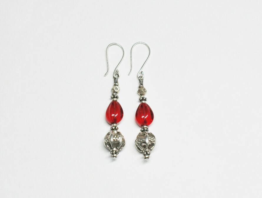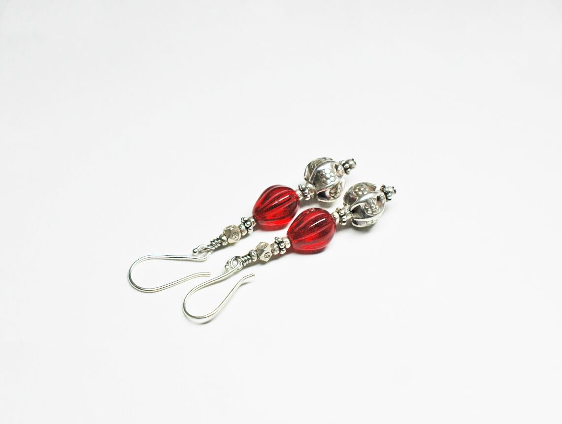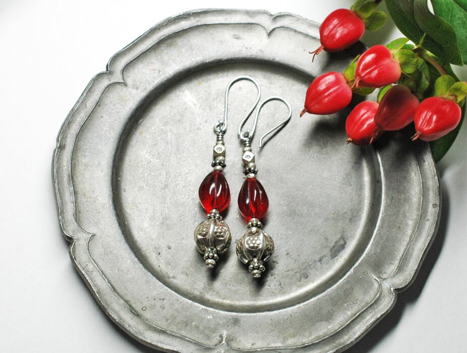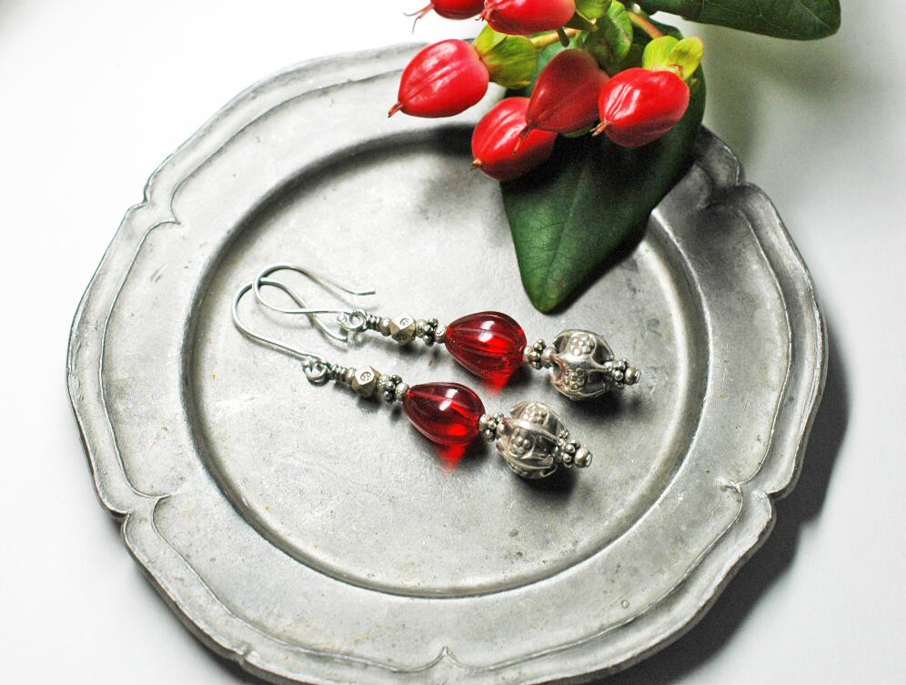 ぷっくりとしたカレンシルバーと、真っ赤なドイツヴィンテージビーズを繋いだちょっと長めのピアスです。