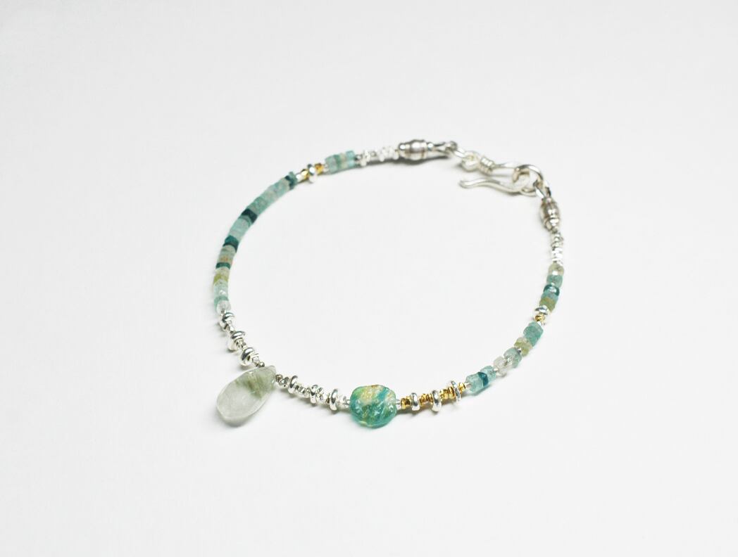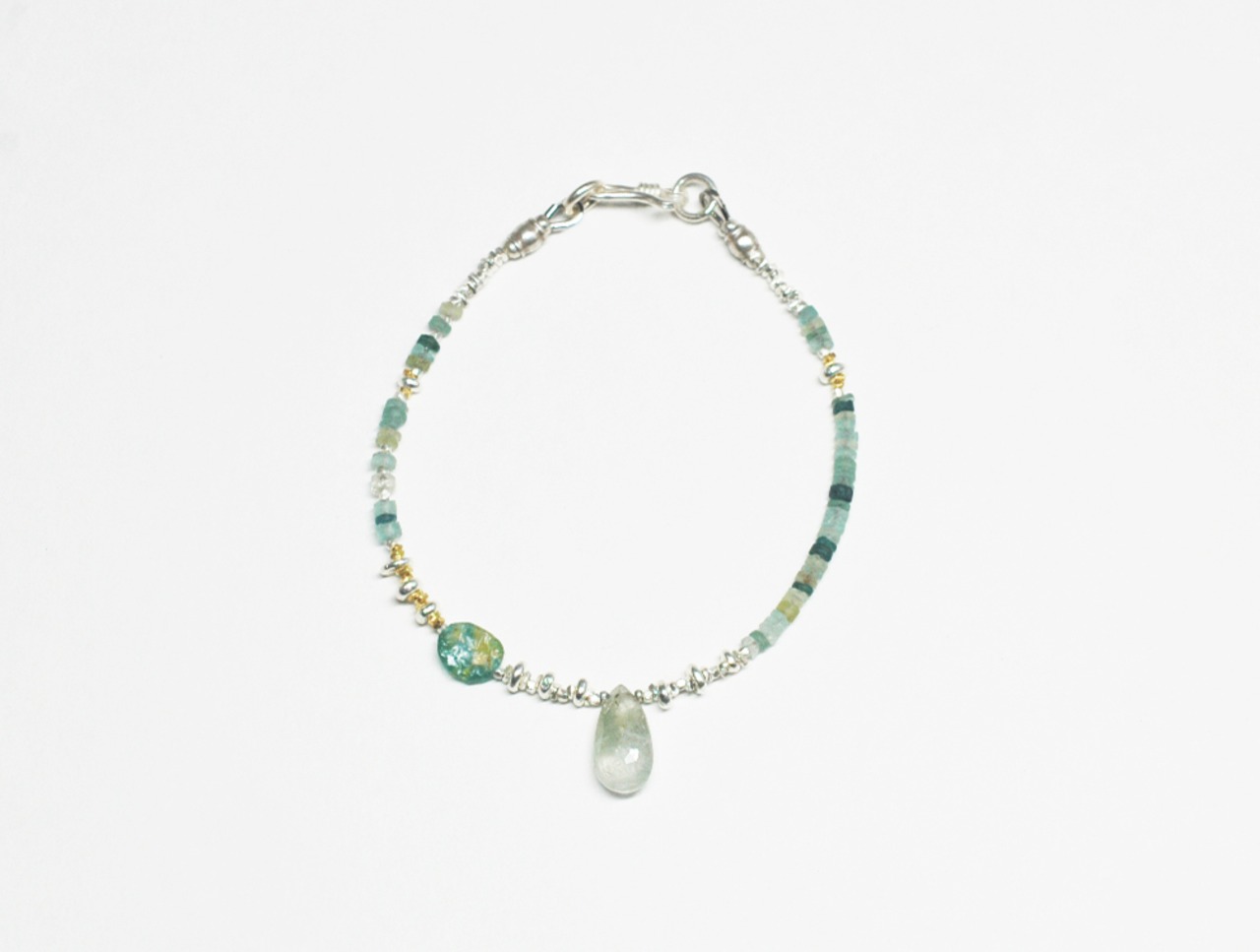小さなローマングラスビーズと、カレンシルバービーズ、一粒内包物入りの水晶を繋いだ華奢なブレスです。